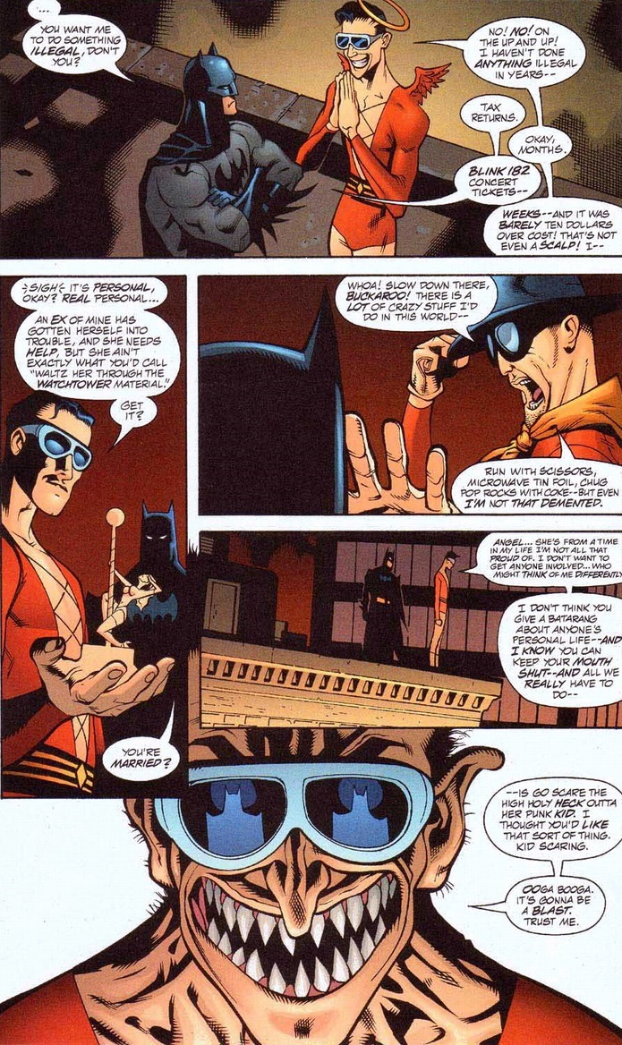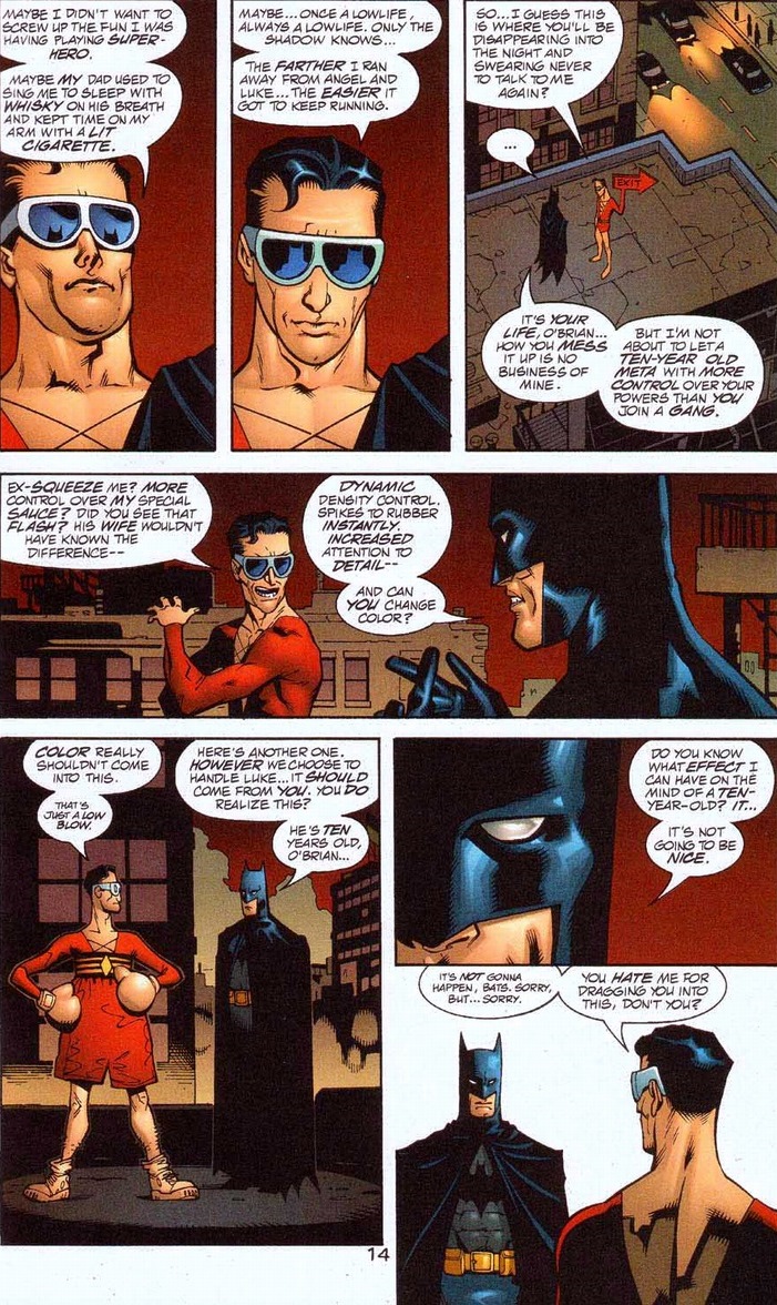 Unlike some of Batman’s trophies, he wears Plastic Man as a belt. The giant penny doesn’t fit around the waist, after all. Y’see the dual benefit of this tactic? The kid gets scared straight while Plastic Man doesn’t have to cough up any parenting responsibility. Major personality changes take time and usually get retconned anyway. We’ll end today with a small glimmer of hope for our rubbery man, because that kid Luke McDunnagh? You’re looking at the future superhero Offspring. Teen Titan certified and everything.