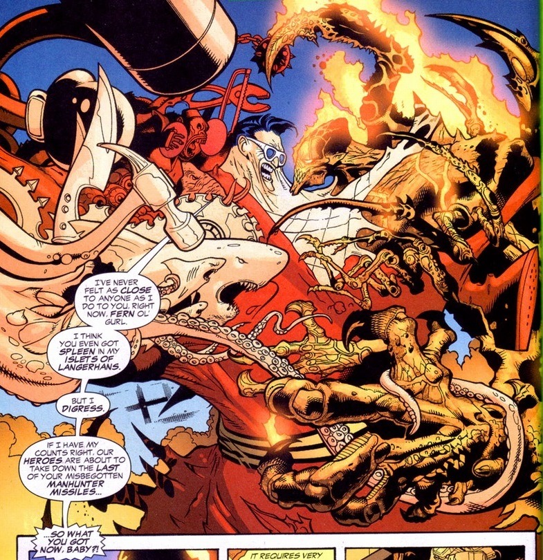 I know we love alternative stories where Superman-type beings go crazy and kill everyone (Irredeemable, for example), but I think we forget just how much scarier it is when Martian Manhunter gets knocked off his rocker.  Combine Superman with Kitty Pryde, the Human Torch, Mystique, and Emma Frost.  You can imagine why the Justice League keeps losing to this guy.  Though on the plus side, evil Martian Manhunter has become quite eloquent when making his villainous speeches.