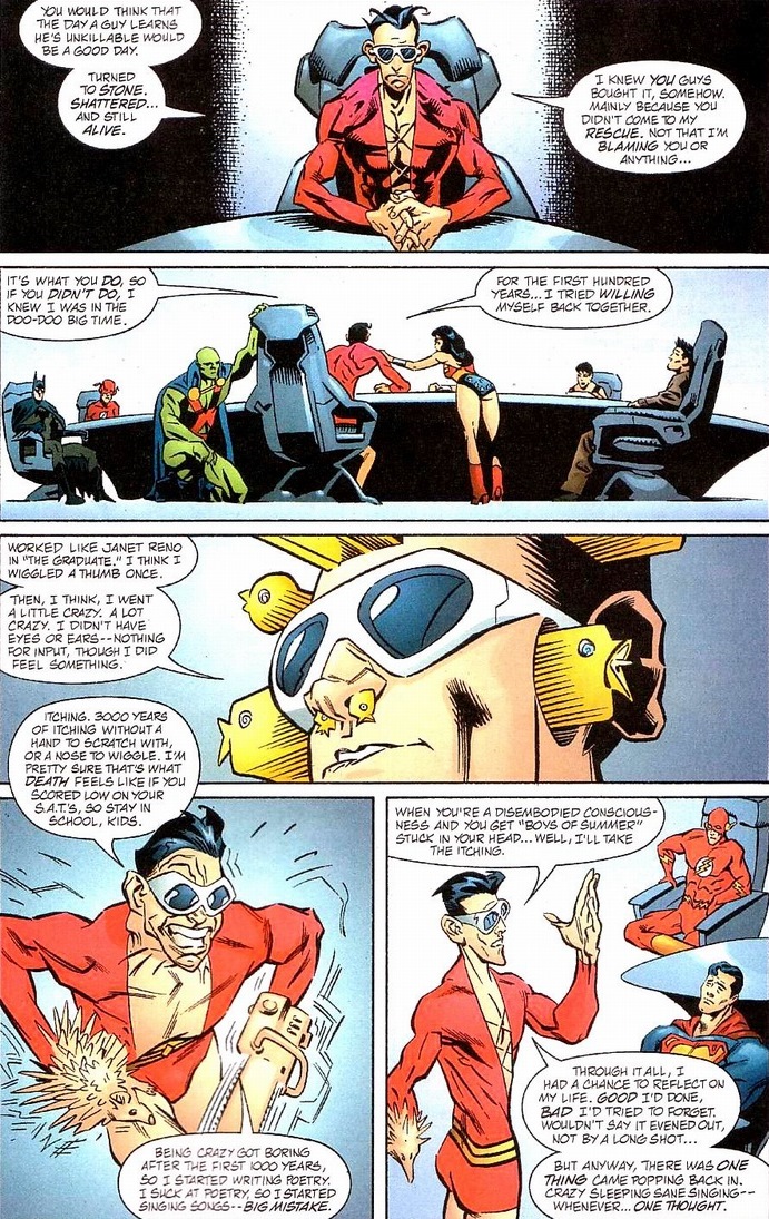 During one of their missions, the Justice League goes back in time 3,000 years.  During the battle, the antagonist shatters Plastic Man and the Justice League are forced to leave him at the bottom of the ocean when they return to the present.  But luckily because of Plastic Man’s physiology (and being a fictional character), our hero survived.  And by survived I mean the Justice League pieced him back together after he had been awake and conscious for the entire three millennia he sat scattered on the sea floor.  It allowed him to do some thinking.  A lot of thinking.