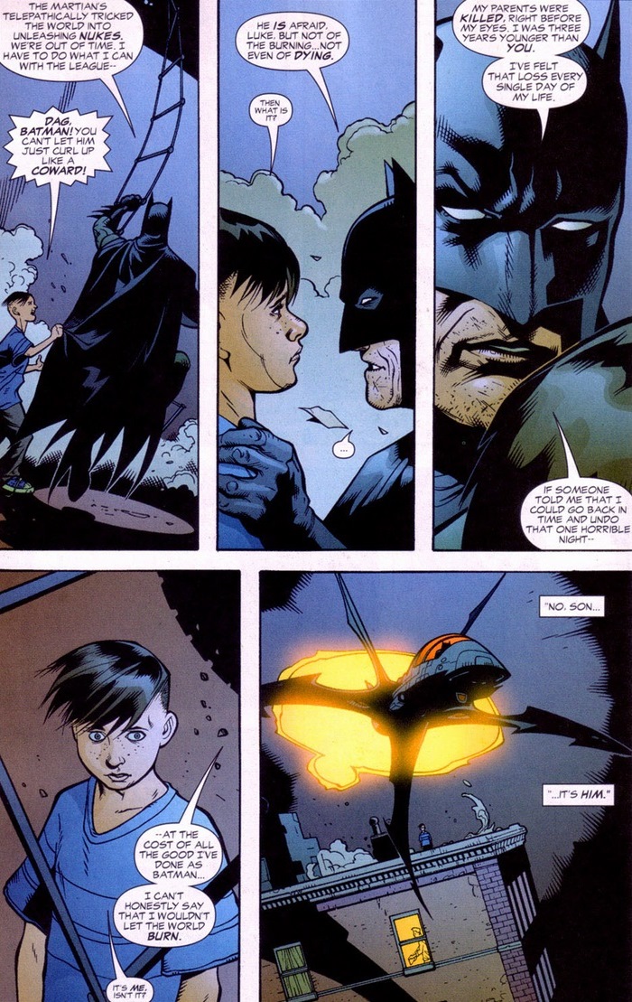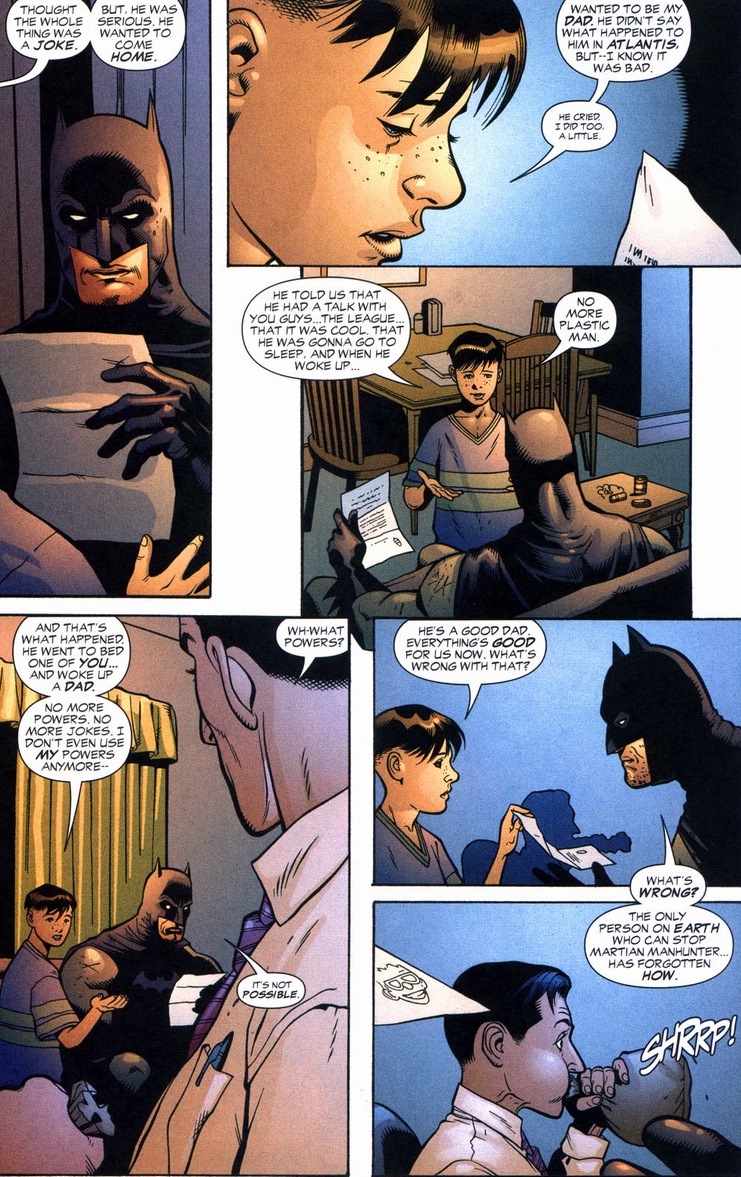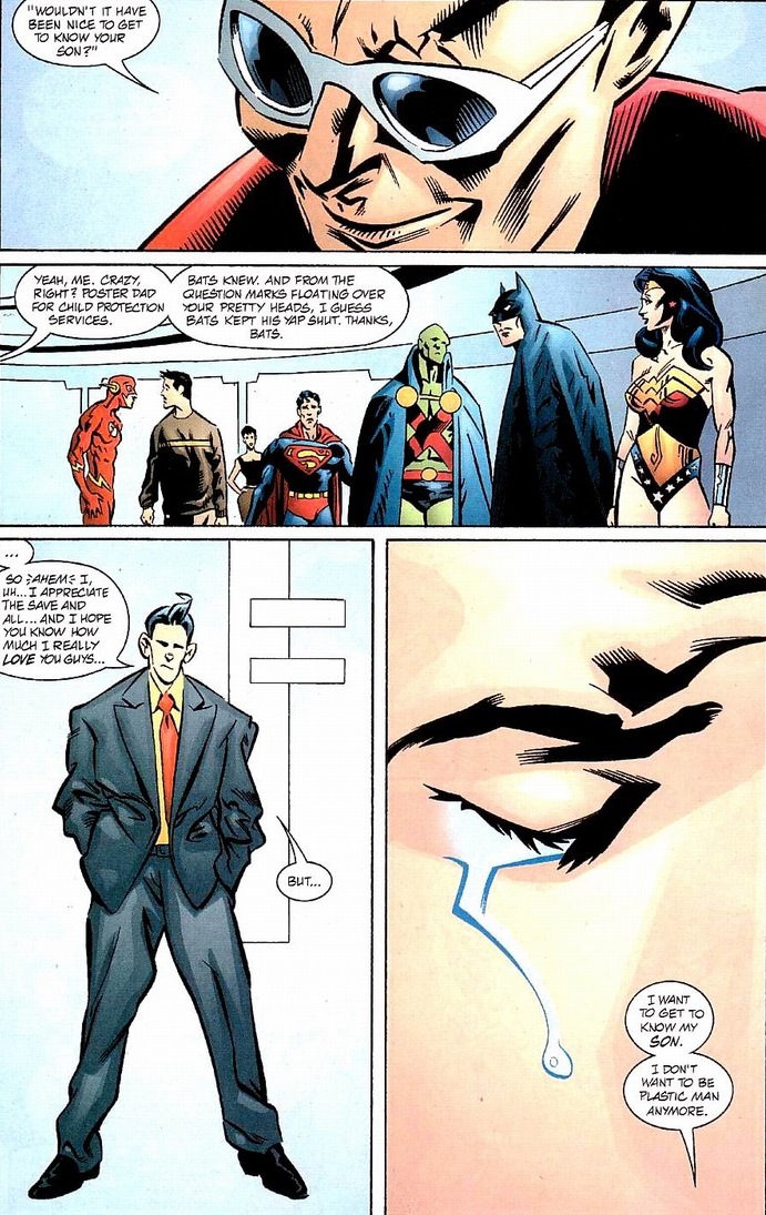 The reason Plastic Man becomes the world’s last hope doesn’t get revealed for another two issues, but I’m going to spoil it now.  Y’see, with a rubber brain, Martian Manhunter’s telepathy can’t affect him.  The same telepathy that allows a being with Superman-esque powers to read and counter actions before his opponents even attack.  But you also just saw the big problem for poor wounded Batman: Plastic Man is no more.  Seriously, he doesn’t exist anymore.