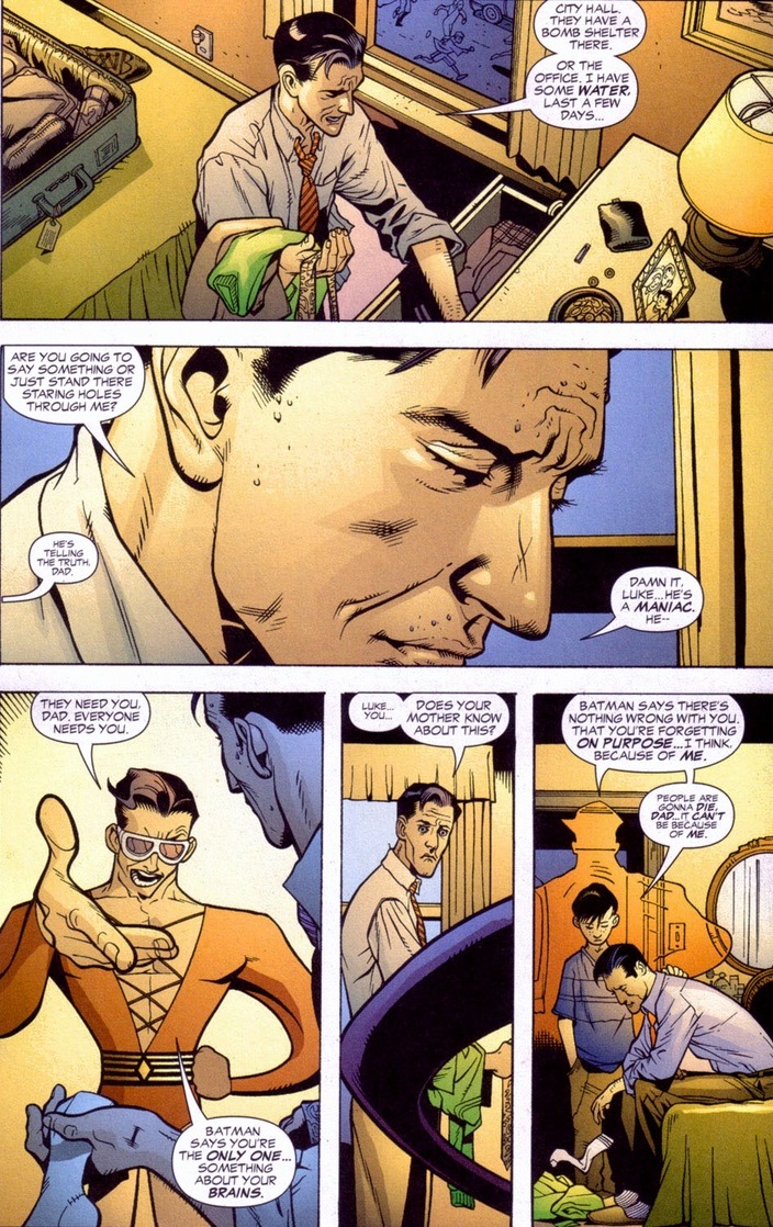 Batman lays out a truth bomb far stronger than any jump kicks or uppercuts.  We all love superheroes gathering up the courage they believed they lost to defeat a foe far stronger and more powerful than them.  Hell, Spider-Man does that every other issue (well, Peter Parker anyway).  So it’s time for young Luke to get his dad back into fighting shape — y’know, to save the world from blowing up.