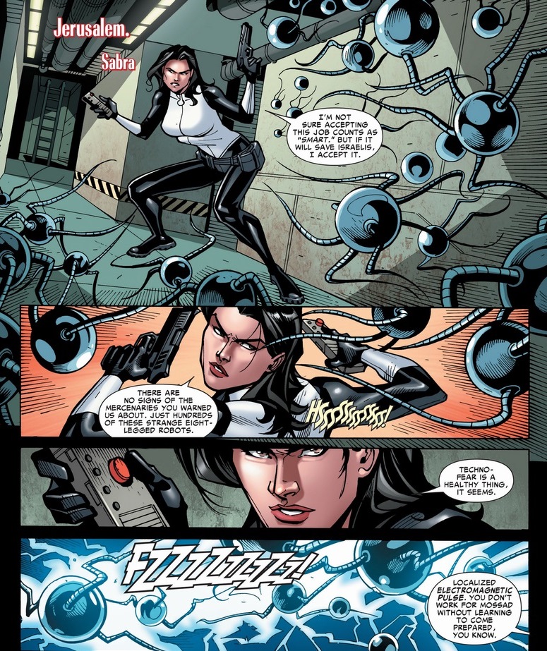 Politics aside, Sabra still shows up whenever an Israeli superhero is needed. Recently (and in her modern costume), she served on Spider-Man’s ragtag team of superheroes to take down Doctor Octopus’ world-dominating plan. Yes, Peter Parker would have used the Avengers and his A-list friends, but brainwashing gets used as a writing tool far more often than you think. Here’s Sabra’s brief moment from the Amazing Spider-Man: Ends of the Earth one-shot, written by Rob Williams & Brian Clevinger and drawn by Thony Silas.