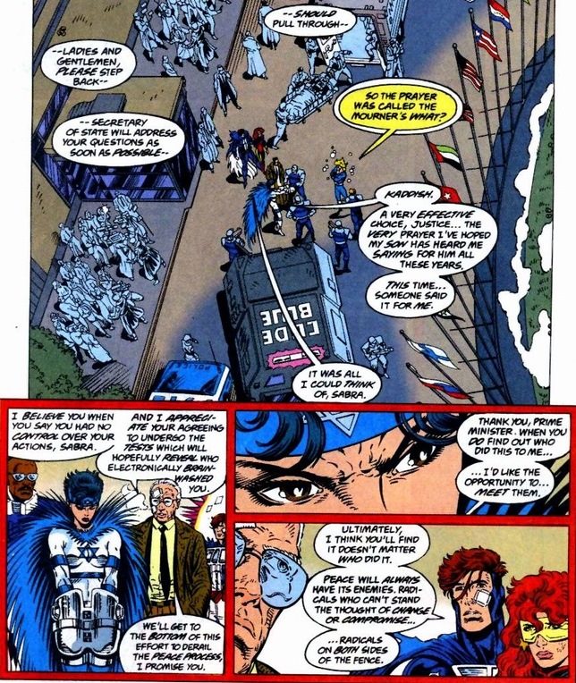 I want to explore a few scenes from New Warriors #58-59, written by Evan Skolnick and drawn by Patrick Zircher. An Arab superhero tries to assassinate the Israeli prime minister. You can imagine how that turns out.