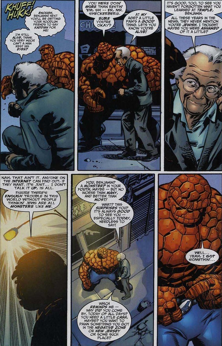 In Fantastic Four #485, written by Karl Kessel and drawn by Stuart Immonen, his Jewish roots shape an entire story. Back in one of my earliest articles, I covered the Thing’s bar mitzvah, but that’s a much later issue. So in his youth, Ben Grimm became quite a street thug before going on that fateful space ship ride.