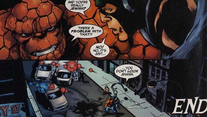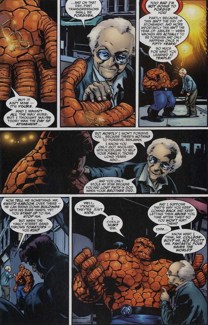 Maybe I’m just a sucker for superheroes reciting Jewish prayers, but I like to think that even with decades of ignoring his Jewish heritage, it’s always there for the moments he needs it. A religious security blanket. Plus, the Thing hears a sermon that’s desperately overdue: