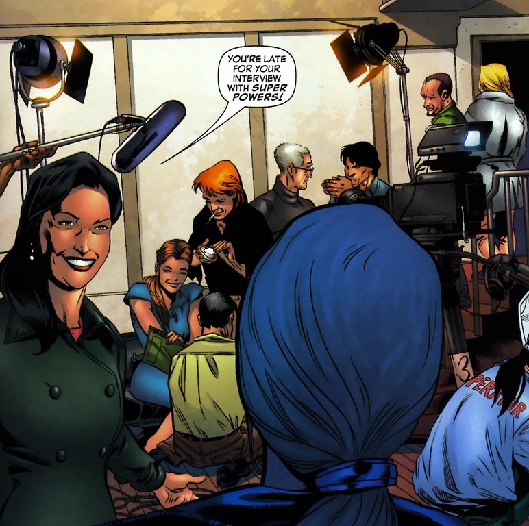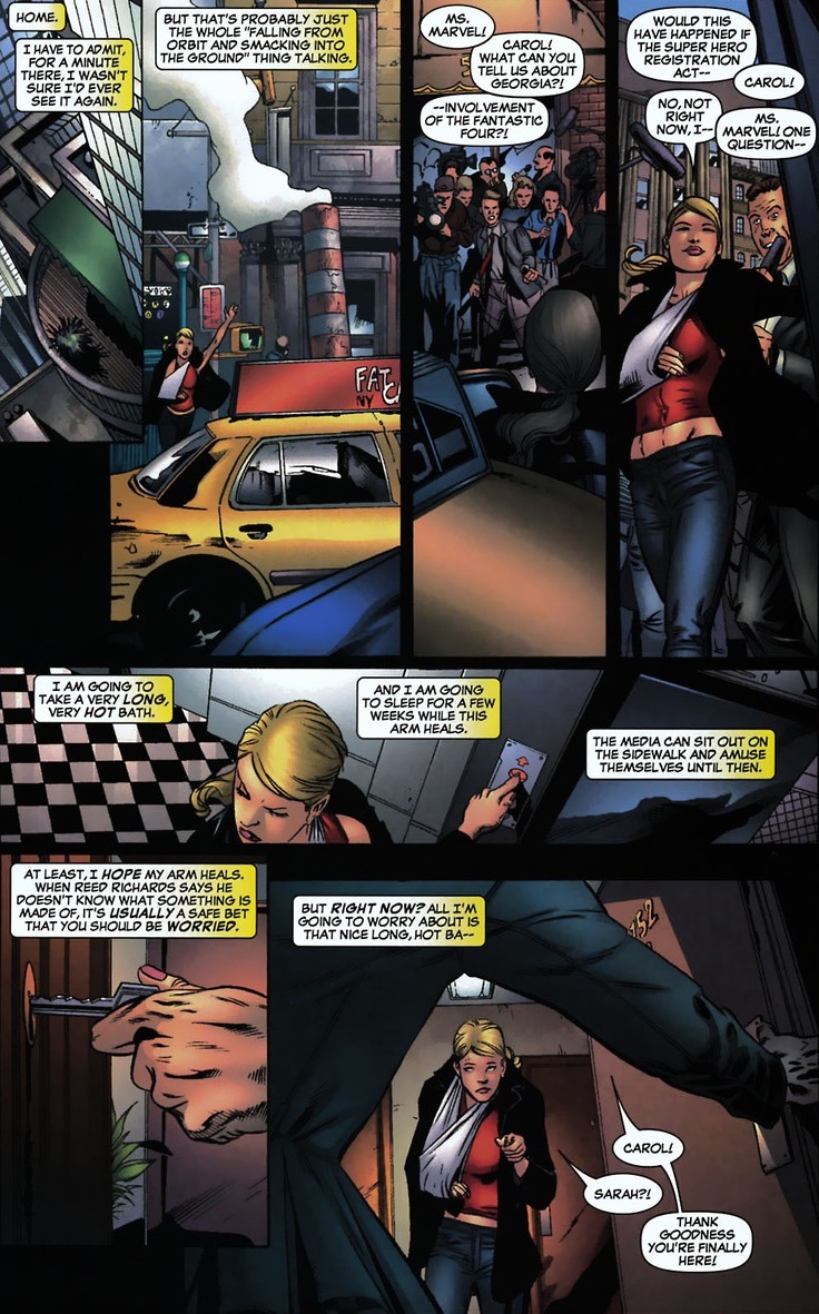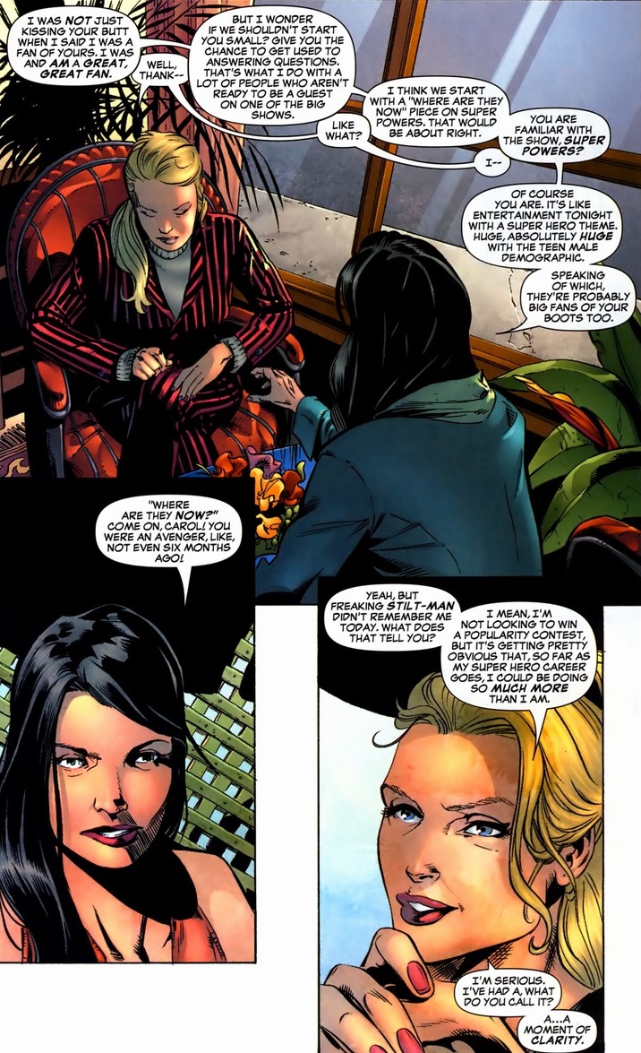 In 2006, Ms. Marvel received a solo series. And it’s very good. Go read it. The first arc deals with a simple idea: Ms. Marvel’s an Avenger, SHIELD agent, space adventurer, and has an arsenal of superpowers that rivals Thor. So why does she sink into the depths of the unknown? She should be up there with Captain America, Iron Man, Spider-Man, and the other superheroes who get their own movies. Well, one step at a time. In Ms. Marvel #3-5, written by Brian Reed and drawn by Roberto De La Torre, Carol hires a publicist.