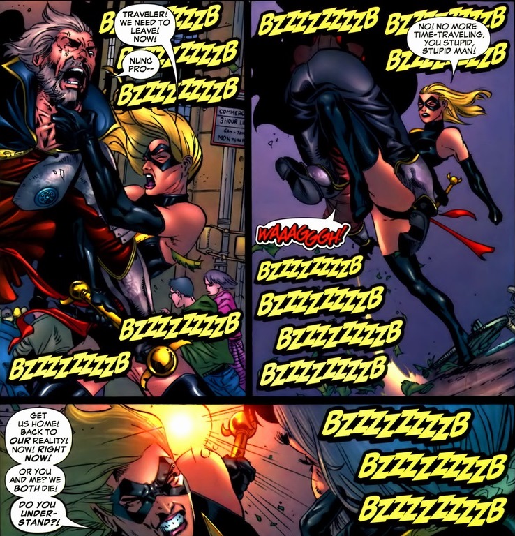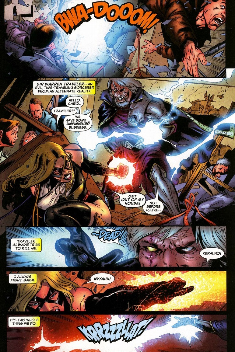 Skimpy costumes aside, I think non-comic book readers underestimate the amount of positive female role models in comics. If we ignore superpowers and just talk about superheroines who are independent, strong-minded, and possess a strong moral compass, we’d have dozens to pick from. Marvel’s Storm, Kitty Pryde, Invisible Woman, Black Widow, etc. DC’s Wonder Woman, Batgirl, Black Canary, Supergirl, etc. Though Supergirl did once date her horse. Back to our story, Sir Warren Traveler continues his mind games, which Ms. Marvel tends to respond to with violence.
