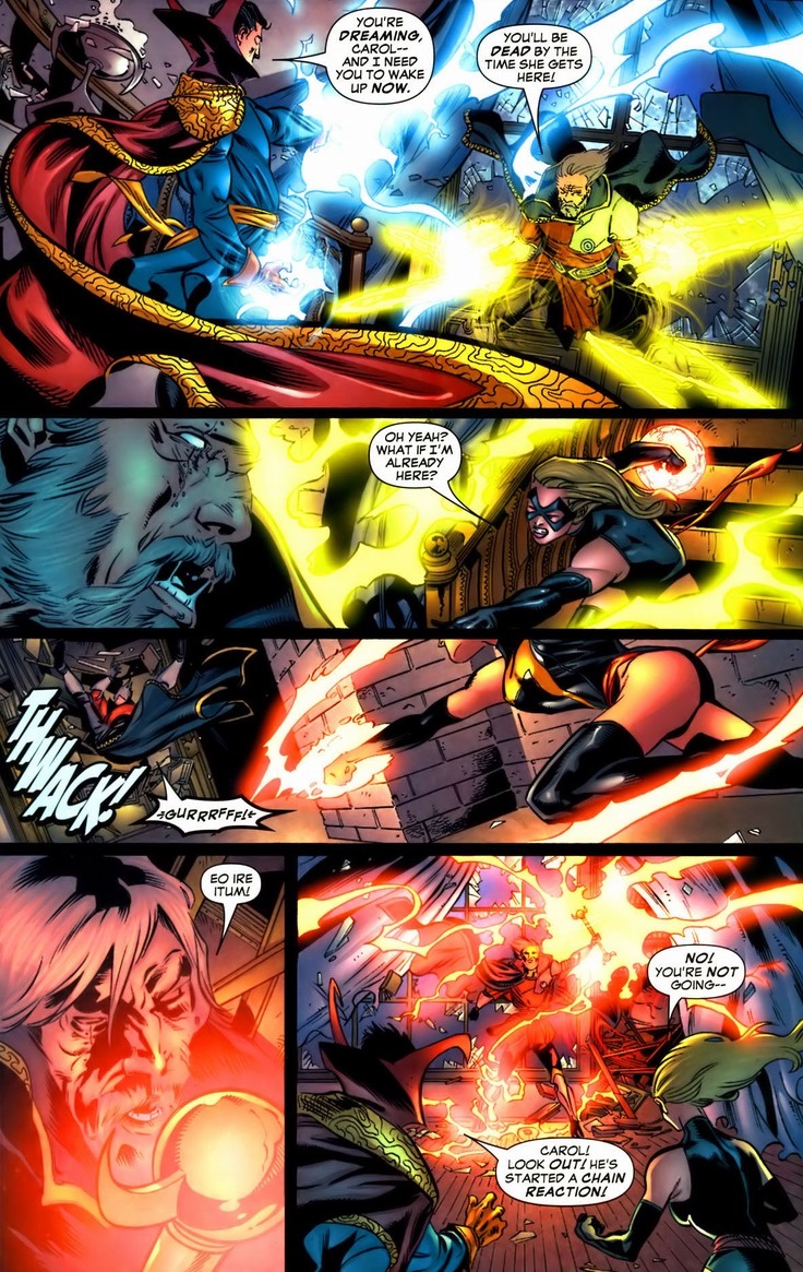 Back to our story, she takes the unconscious sorcerer to Dr. Strange, who’s rocking facial hair that perfectly matches the flamboyancy of his outfit.