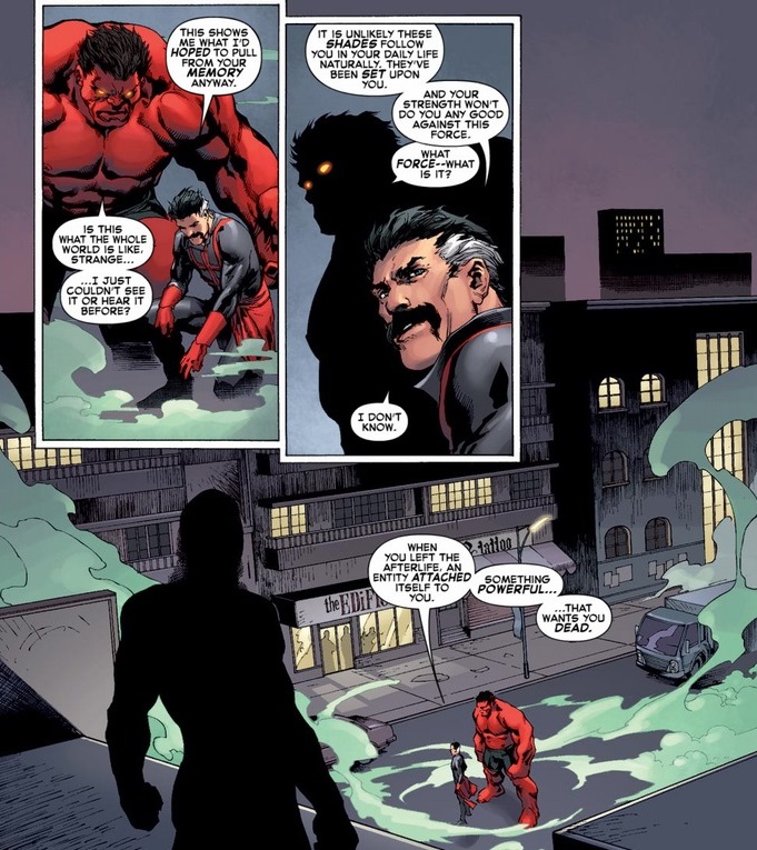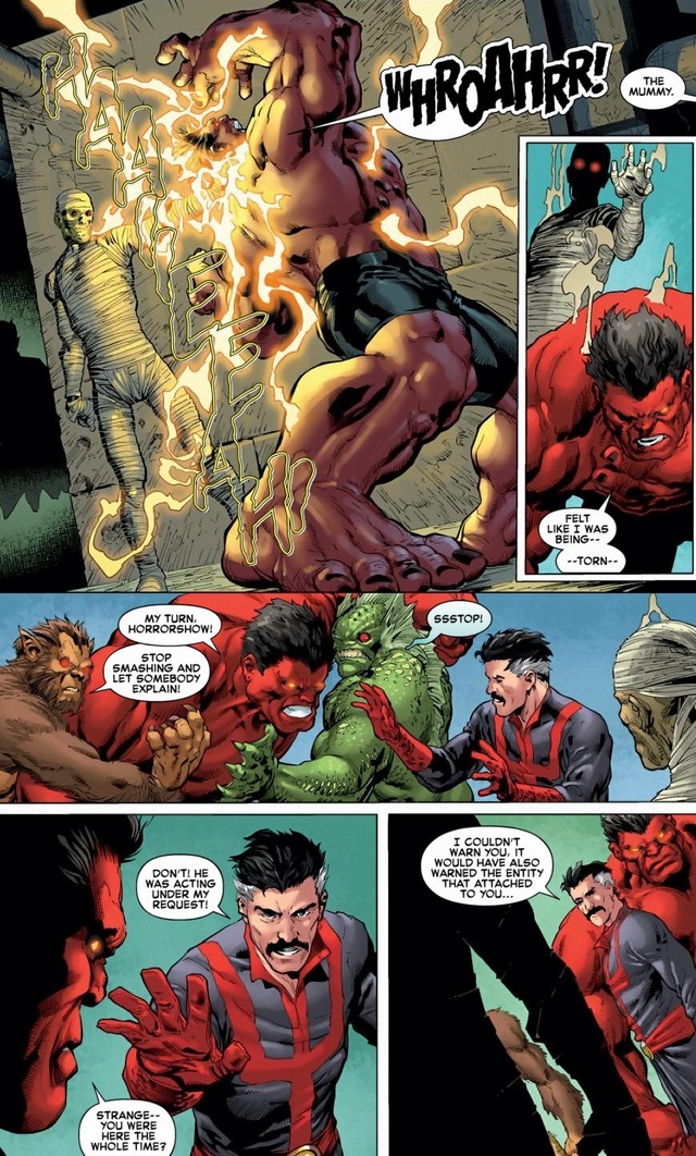 Strange deserves a broken skylight. Fortunately, when more visions/zombies/ghosts/whatever attack poor Red Hulk, Strange redeems himself — in a way only Dr. Strange can.