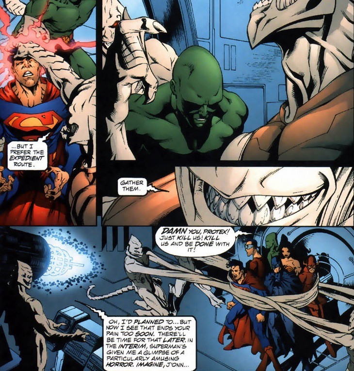 But even with an arsenal of space weapons, the Justice League loses. Oh, spoiler alert. Protex establishes himself firmly as a stereotypical evil mastermind. Because y’see, just because the Justice League can’t punch their way to victory, they have a cunning their enemies don’t possess. I mean, sure, not for the first three issues of this arc, but it’s a slow burn.