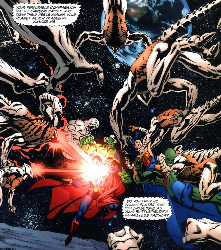 We, the readers, start off the fight just as nonchalant as the White Martians. It’s a battle on the moon! Blows get exchanged! The White Martians brag about their superior superpowers! The Martian Manhunter puts his clothes back on! All that normal stuff, and then finally the big reveal. The White Martians never stood a chance against this level of insanity.