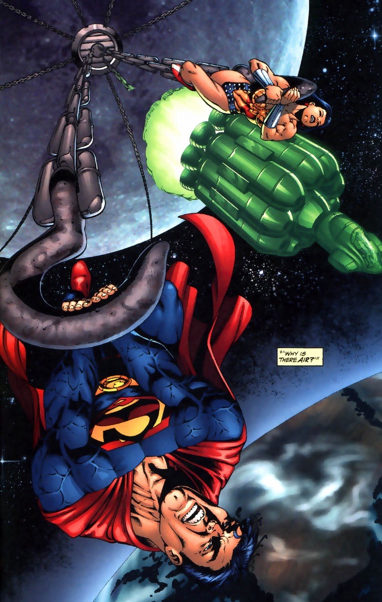 Yes! The Justice League is literally pulling the moon. With their muscles. They wrapped a chain around the entire thing, flexed a little bit, and are now literally dragging it out of orbit. Over the past year and a half, I’ve stated no less than five times that Superman has the ability to bench press small planets. And now, in all the brilliant glory laid out above — I have proof. I feel like I’m a cult leader who has been shockingly proven correct. Turns out that barn I claimed housed our spaceship messiah actually packed a Jesus-filled rocket ship the whole time. Also, did you know the Justice League has a moon-sized chain?