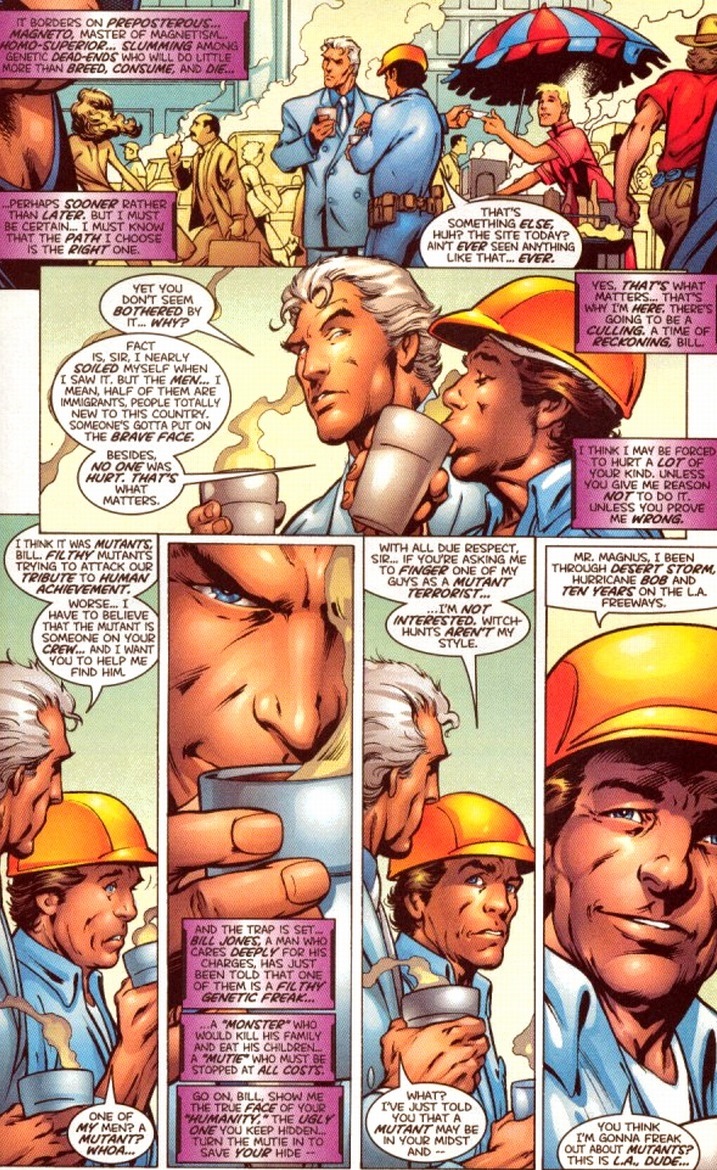 I’d like to tell you that Bill Jones argues an exciting and suspenseful battle of words with the disguised Magneto.  By not revealing that information, I could definitely amp up the suspense.  But look, dear Bill Jones doesn’t stand a chance — Magneto stacked the deck against him from the very beginning. Magneto’s cheating, and even Magneto himself doesn’t realize it yet.