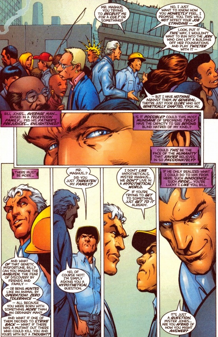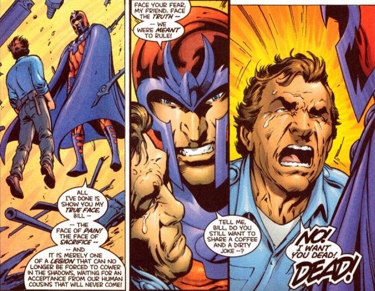 See?  That’s what makes this issue genius: Magneto simply manipulated the situation until he received the answer he wanted, instead of accepting that maybe his ideals aren’t so accurate. Supervillains tend to have a bit of an ego on them.  And what about Bill Jones’ final cry?  Surely Magneto must realize his mistakes.  He’ll shake Bill Jones’ hand and apologize while maintaining eye contact.  That’s the reasonable, intelligent decision after Magneto essentially poked Bill Jones until he yelled to stop.  Right?