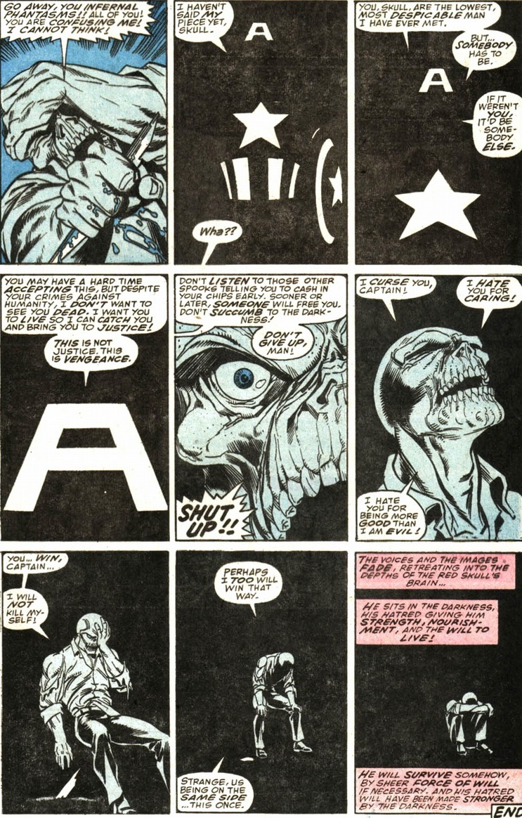 Can you detect an upcoming theme?  I mean, no one knows where he is and Red Skull has no way to signal for help.  Though you claim suicide as the coward’s way out, you know who else committed suicide?