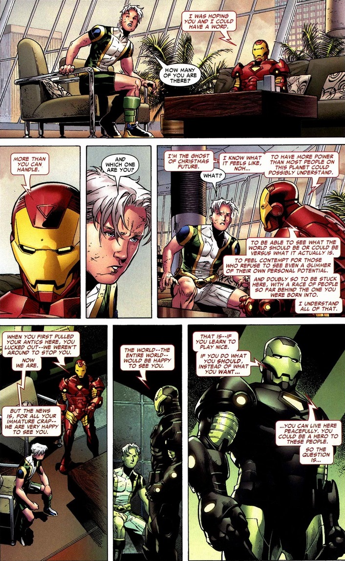 While prison gave him lots of time to stew about his current predicament — his own conquering impotence — Earth’s premier secret society of borderline-sociopathic superheroes, the Illuminati, decided to use this weapon in another way.  And despite all their manipulating, backstabbing, lying, and downright despicable actions they accomplished during their tenure, this ranks as one of the best decisions they ever made.  Witness it for itself in New Avengers: Illuminati #4, written by Brian Michael Bendis & Brian Reed and drawn by Jim Cheung.  Then we’ll finish with four pages from Secret Invasion #6-7, written by Bendis and drawn by Leinil Francis Yu.