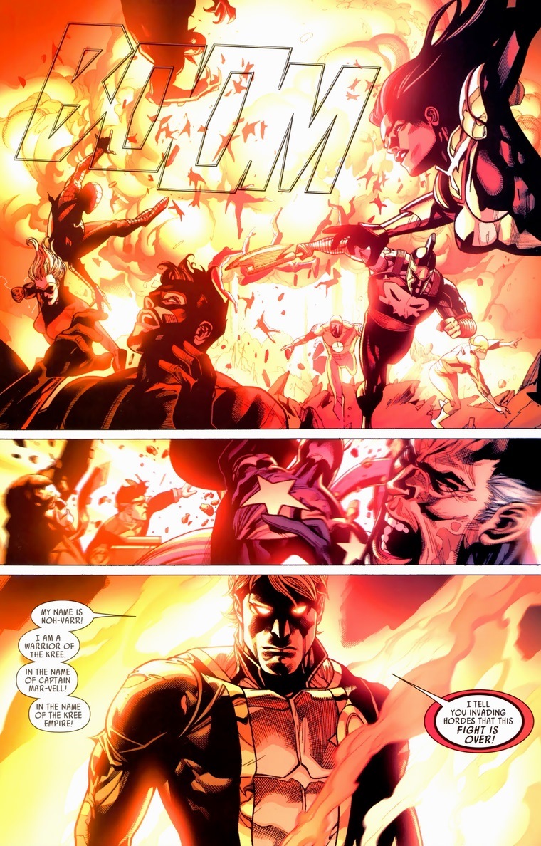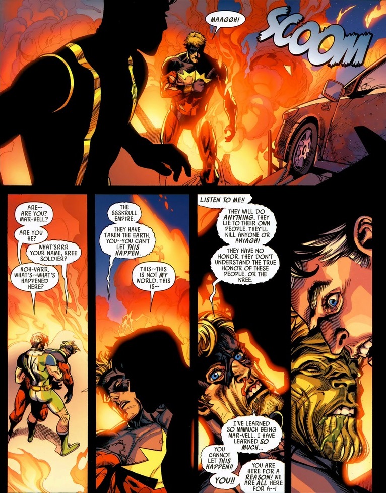And he does.  And he finds Captain Marvel.  And he becomes the hero we darn tootin’ know he should be.  When the Skrulls, sworn enemy of the superior intellect Kree, invades Earth with their fancy shapeshifting powers, Noh-Varr figures the Illuminati have a good point.  He could either stay rotting in prison or kick the butt of those green monsters currently ravishing his current planet.  Also, Captain Marvel has a secret: