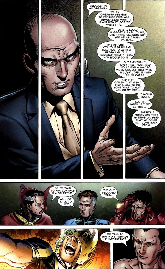 Professor X, despite being the kindly Martin Luther King Jr. of mutantkind, has a history of subtly changing the minds of those he wants to join his side.  Or to forget important information.  Or if he accidentally projects a dirty thought.  Look, Charles Xavier’s morality lies on the side of heroism with a fair amount of “ends justify the means” sprinkled in.  But at least the good professor justifies his Noh-Varr inaction: