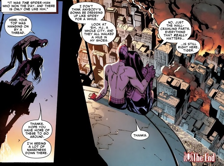 And her current outfit still covers far more skin than most female superheroes’ costumes.  Look, I know so many comic book readers rose up in anger after Mephisto dissolved Peter and Mary Jane’s marriage.  But c’mon, we’re all intelligent people, right?  The status quo always returns, just like superheroes when they die.  It may take another five years, a decade, maybe even longer, but the two are destined to get back together.  We all know they’ll end up married again, so can’t we just enjoy a single Spider-Man for a while?  Seriously, after my friends and family, there’s nothing I love more than superheroes, and we must trust that the writers know what they’re doing — negativity only drains creativity and passion.  From everyone.  Stop the angry YouTube rants.
