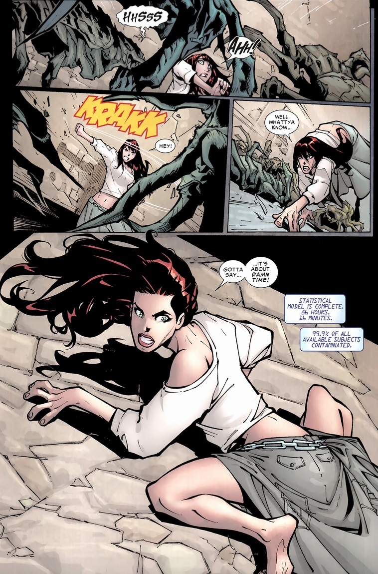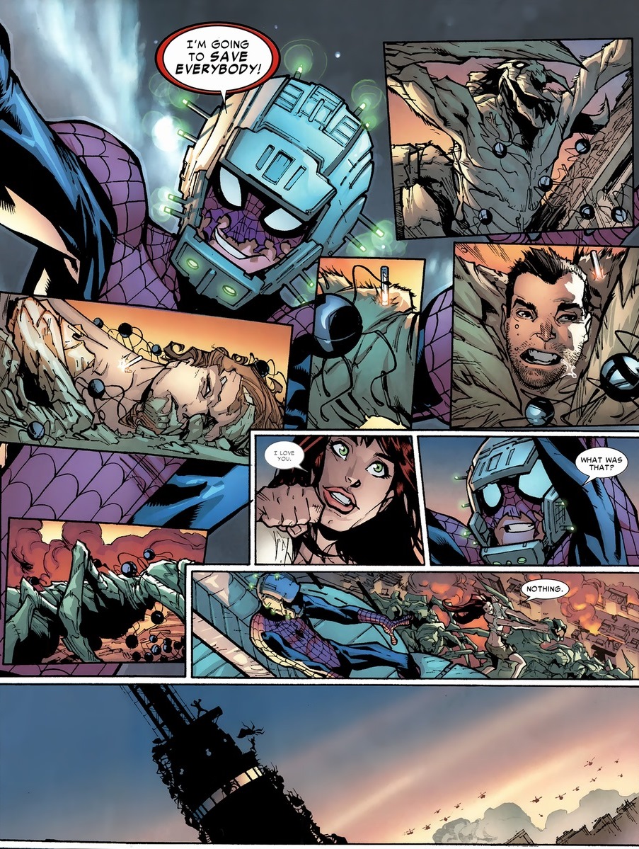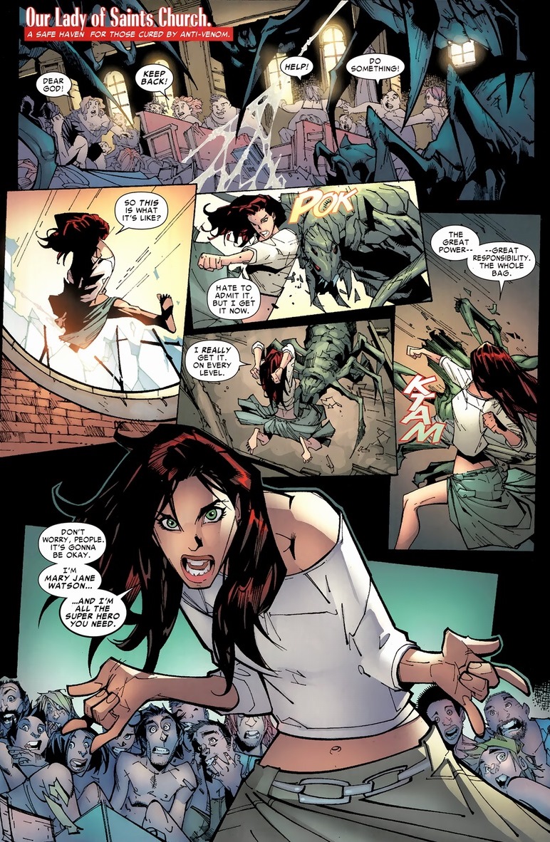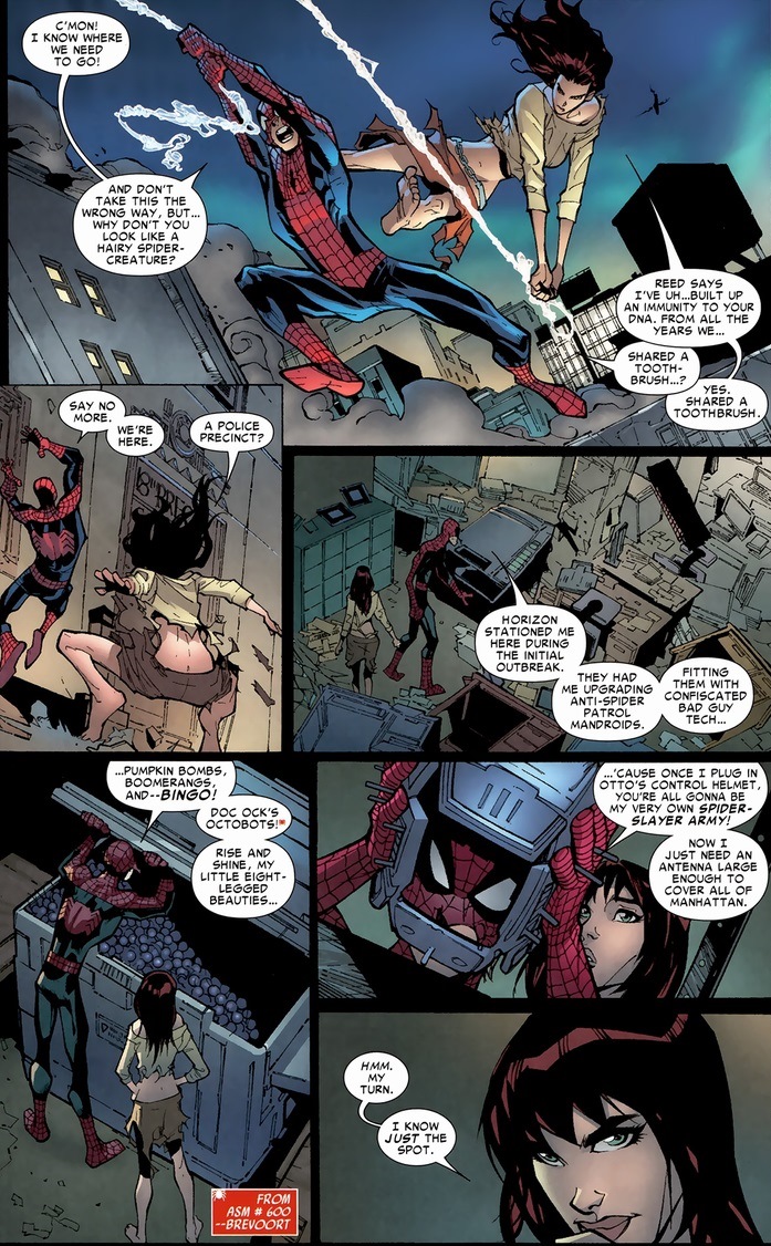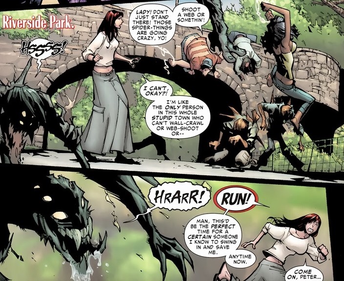 2. That pose she does in the sixth page you scanned looks way awkward. Also, if you think this is the first time that Mary Jane’s been affected by Petey’s love juice, think again. In the Spider-Man: Reign story, MJ died because of her constant exposure to Mr. Parker’s toxic baby batter. Yeah, it was basically a “What If” story, but it was still a published story.