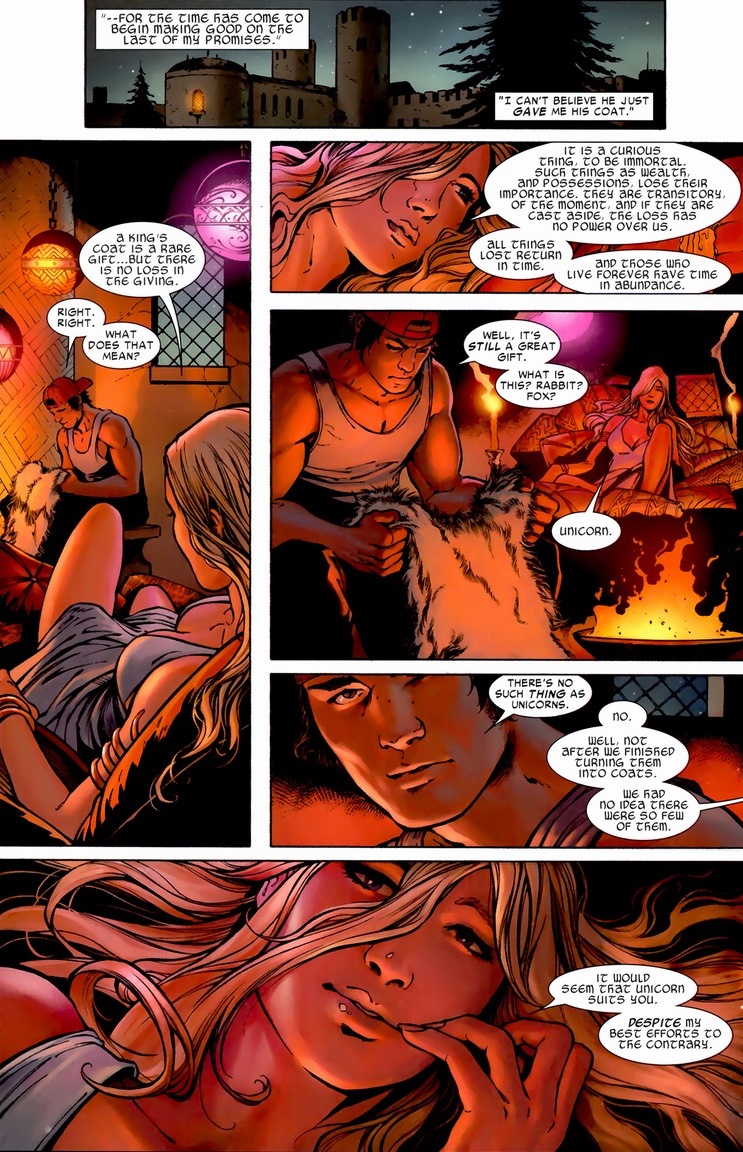Are you sad that there’s less flirty banter than the first part?  Don’t you worry, because a near-death experience prompts Bill and Kelda to lie in sensual anticipation with the three most romantic symbols of Asgardian culture: a bed, fine clothing, and heavy weaponry.