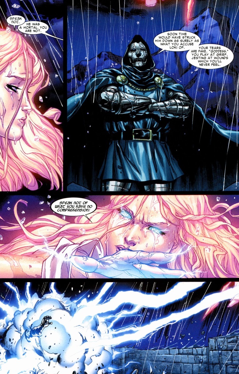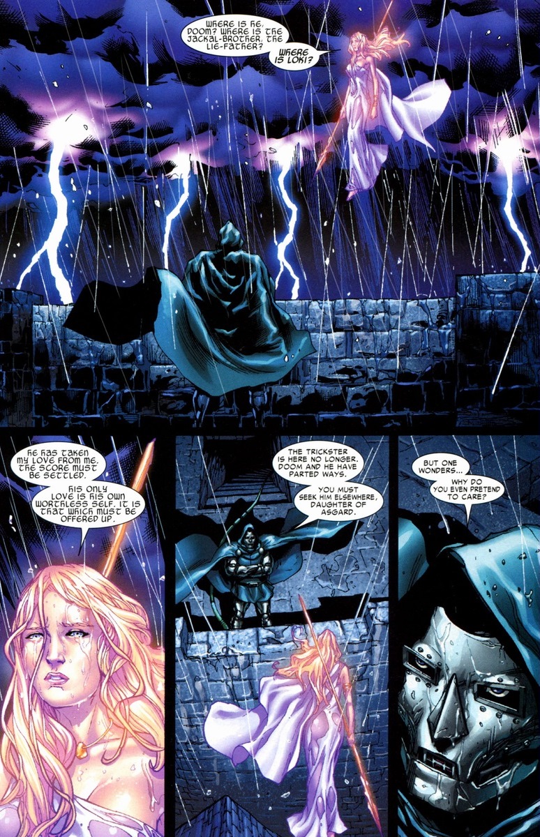 Posted: 04/02/2014 Filed under: Marvel, Relationships 2 CommentsWe don’t need a lengthy introduction, right? Bill died at the hand of Asgardian traitors and Kelda’s out for revenge on those that killed him. Like Loki and Doctor Doom. But y’see, while Loki’s the god of trickery and mischief, the evil doctor doesn’t bother with smokescreens and wild goose chases. You want him? He’s in that giant castle with his likeness plastered on it. Go get him.