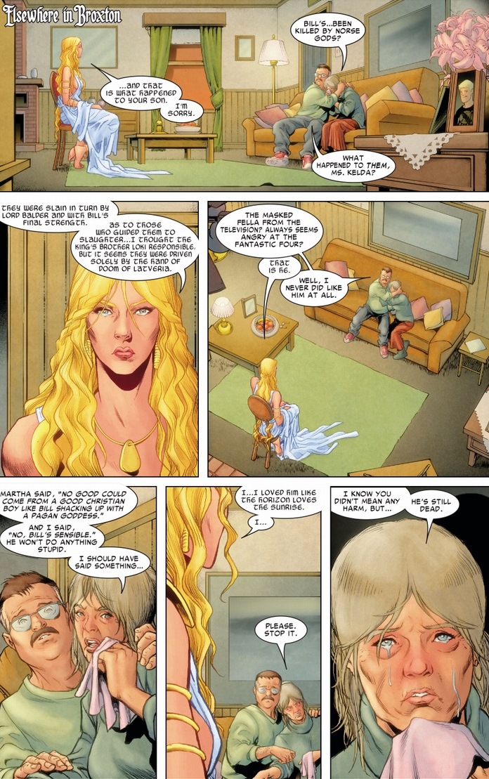 Recall the first part of our story: Bill essentially abandoned his friends and family to pursue a new life with Kelda in Latverian Asgard. Which means no one back in Broxton, Oklahoma knows about his death. Because Asgardians don’t have an official means of alerting loved ones of a death in battle — they light the corpse on fire in a boat — our mourning goddess has to fulfill the responsibility herself. Now’s a good time to get your tissues ready.