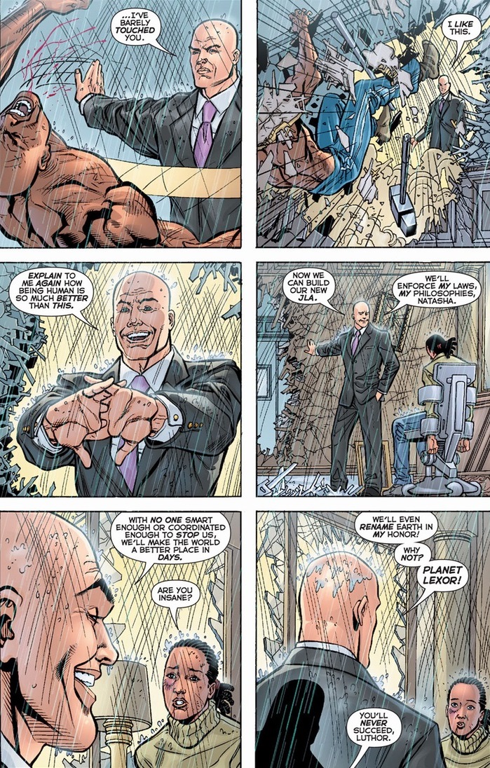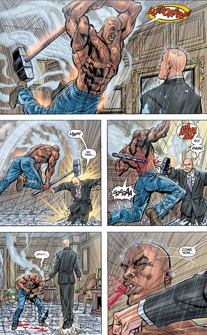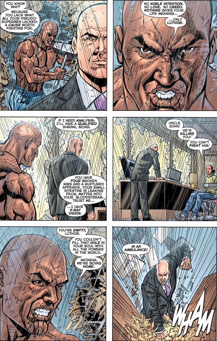 Luthor’s ego’ll always bring about his own self-inflicted fall, even if Natasha Irons wasn’t a scientific super genius like her uncle. Because though Steel can’t win against a superpowered Luthor, he can totally wipe the floor with a normal Luthor. Lex really should have learned Muay Thai.