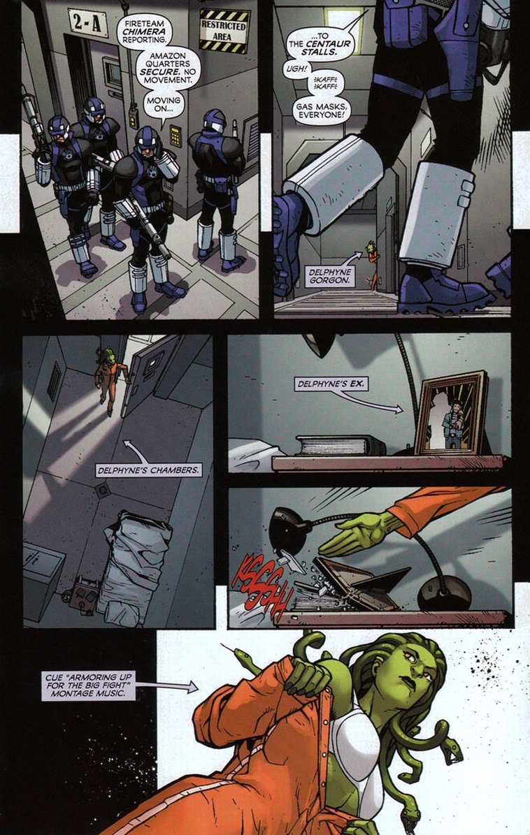 But our focus’ll be turned away from these two for a while.  While our article today will totally end in a full confession of passion and delight for our two lovers, the climb will be slow and bloody.  Before the inevitable make out session, Delphyne has some goals of her own to accomplish first.  Like getting out of the awful Olympus Group prison that Athena put her in.