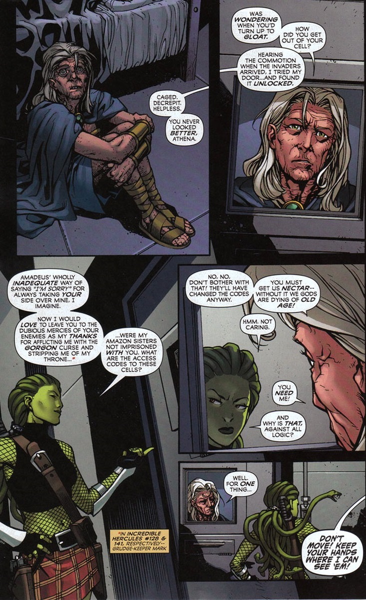 Hercules died.  At least for the short time that this article takes place.  In an awkward tip of the hat to Delphyne’s intuitions/grudges, Athena betrays Hercules by having him get caught in a god-destroying explosion.  She totally feels bad about it, but that doesn’t stop her from doing it.  To somewhat justify her actions, Athena’s only allowed one “champion” at a time, and in order for Amadeus Cho to have risen to that honor, Hercules had to go.  Like the mob, it was strictly business.  Luckily, with Amadeus wielding Hercules’ adamantine mace, Bruce Banner’s Bannertech shields, and his own genius mind and sharp fashion sense, the new Prince of Power puts up a fairly solid fight.  But first, a reunion.