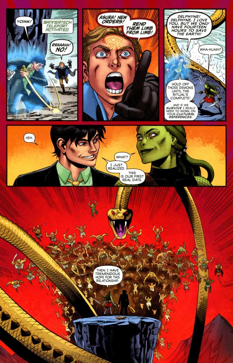 The next few pages allow comic books to truly shine as a literally medium.  As Amadeus fights his opponent, Delphyne fights Atlanta at the exact same time on the exact same page.  It’s a small beneficial joy of comics and it works wonderfully — after all, what better way to prove the two are worthy of each other’s affections?