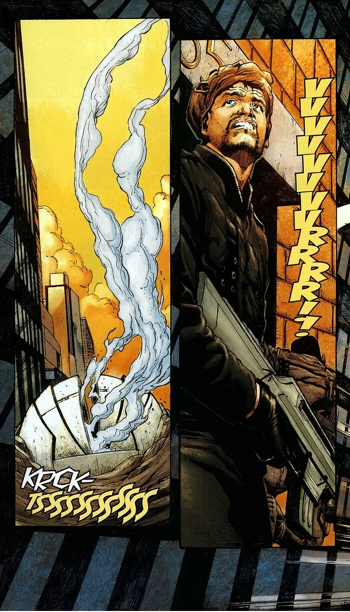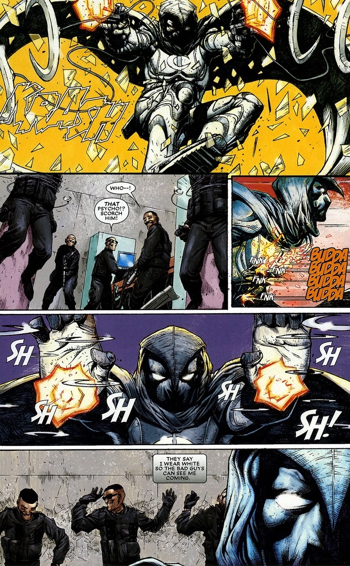 Moon Knight reveals later that his armor’s made of carbonadium — a poor man’s adamantium. It’ll totally block bullets and explosions and probably a knife or two. Also, Spector never really dodges attacks — pain equals redemption and whatnot. I didn’t actually think of this until now, but walking into bullets makes bad guys far more fearful than wild acrobatics. Daredevil can hop over rocket launchers and do triple axle grinding backflips (probably not a real thing) off flagpoles, but criminals treat him like the lottery — he can’t possibly forward spinning leaping somersault over every bullet; they’re bound to win eventually. But Moon Knight treats gunshots like they came from Super Soakers and the bad guys wet their pants.