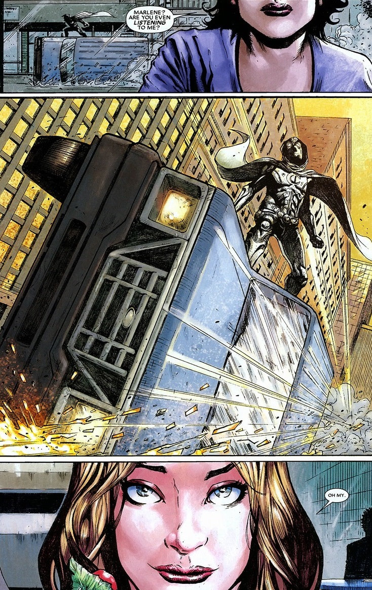 Despite Marline being Moon Knight’s ex-girlfriend, what woman wouldn’t attracted to a caped man riding an overturned van down the road? Best part of this scene is Moon Knight’s seemingly nonchalant body language, as if sliding around on vehicles is just his preferred mode of travel in New York City. Some people take the subway, Moon Knight surfs on sideways cars.