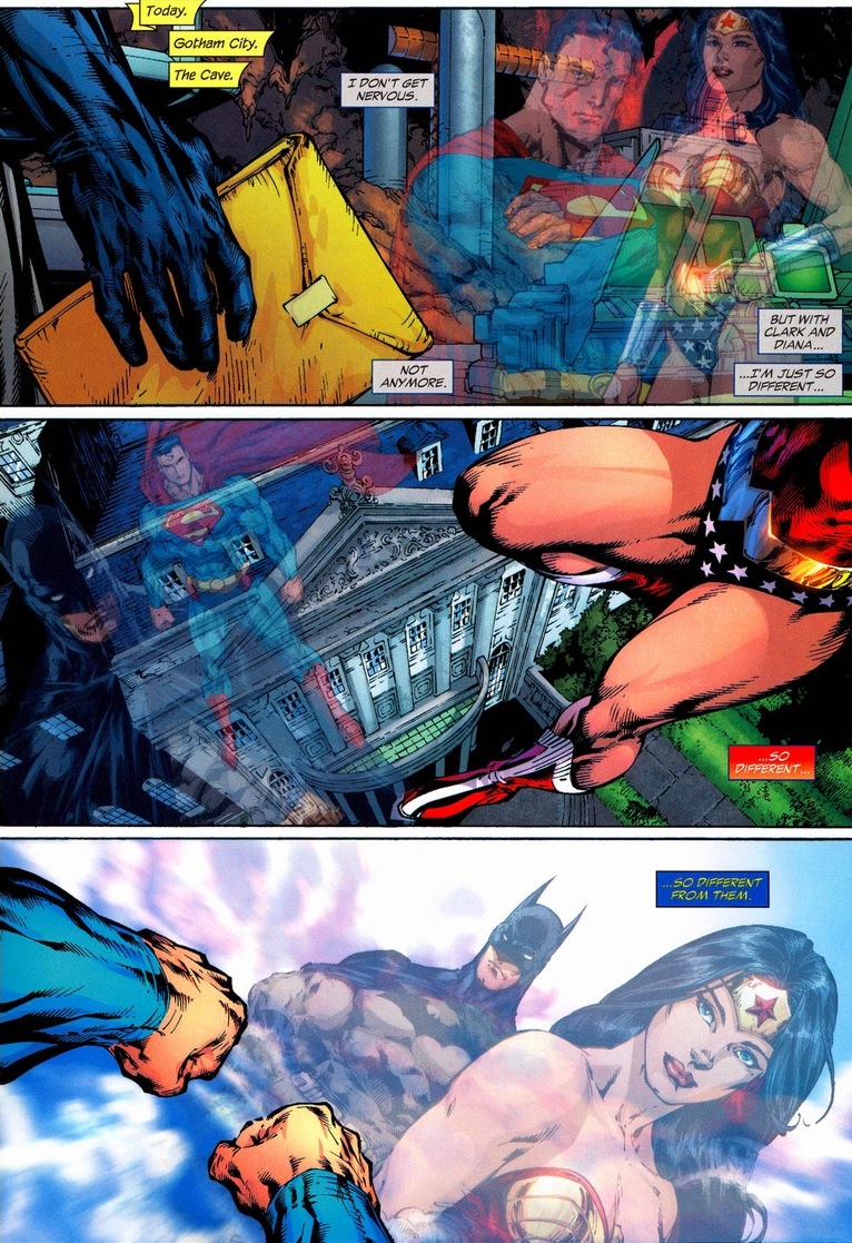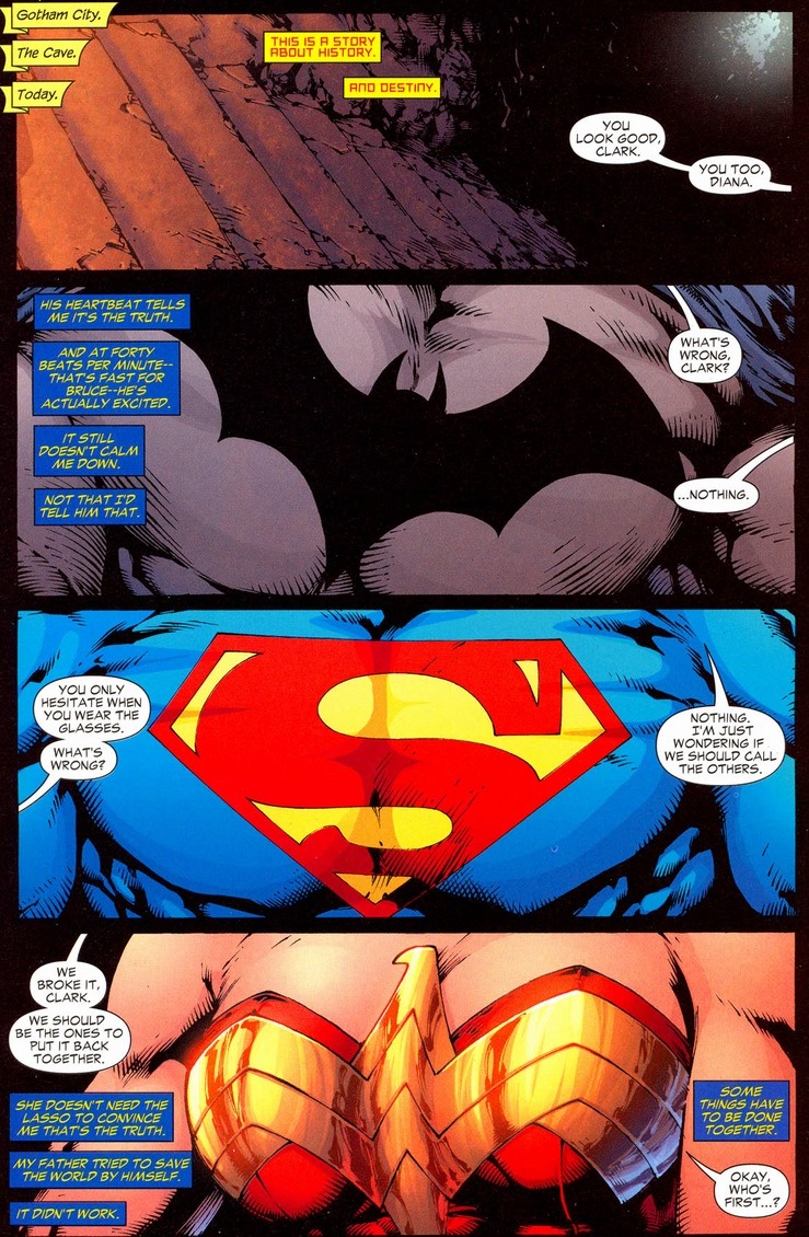 The gray text boxes below are Batman’s, the red are Wonder Woman, and the blue are Superman.