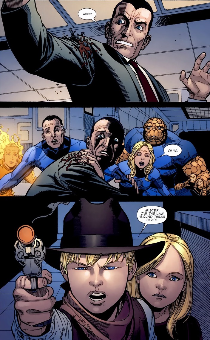 why was anyone worried about Reed getting a bullet in the head? The guy is a human wad of silly putty. I have to admit, as much as I love the character of Sue, and the adventures of Ben Grim, the only thing that makes the Fantastic Four interesting are those kids. The time they were babysat by Laura X-23 Wolverine’s daughter (not clone) was a gas.