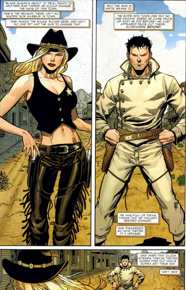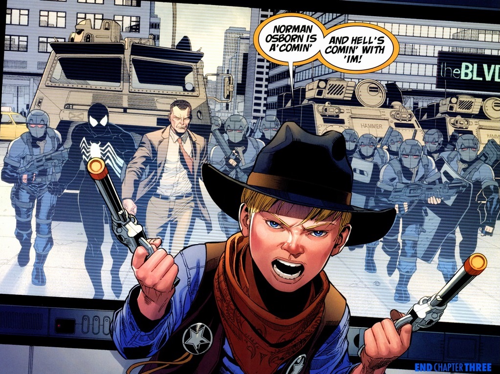 Now, Osborn doesn’t know the Fantastic Four’s busy with gunslingers.  But he figures a small army and Venom should be enough firepower to prevent a fight.  Maybe some polite adult conversation while Venom snacks on a squirrel or something.  A rational person would handle Osborn in that way, but unfortunately, the HAMMER commander’s dealing with children.  And children are insane.