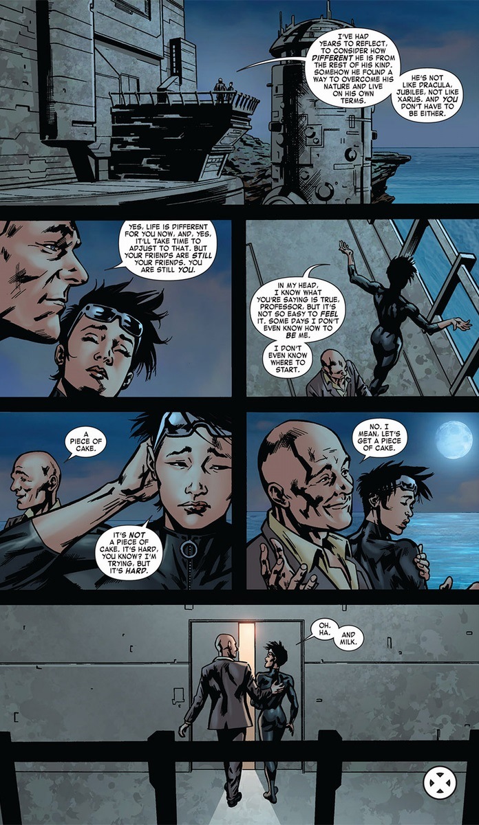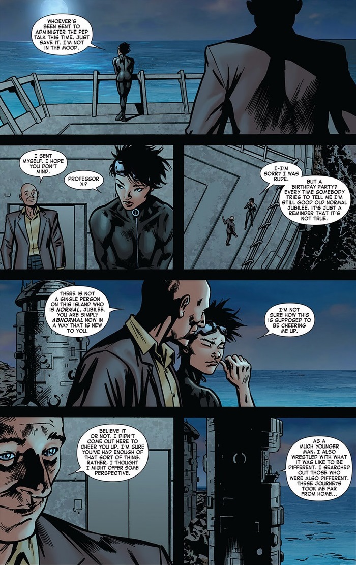 We jump five issues to a simpler time, where Professor X still had that shred of kindness and teacher-ness deep inside him before all that uncovered psychic manipulation tainted his reputation. We start with an angry Jubilee, as most people who are turned into vampires against their will tend to be: