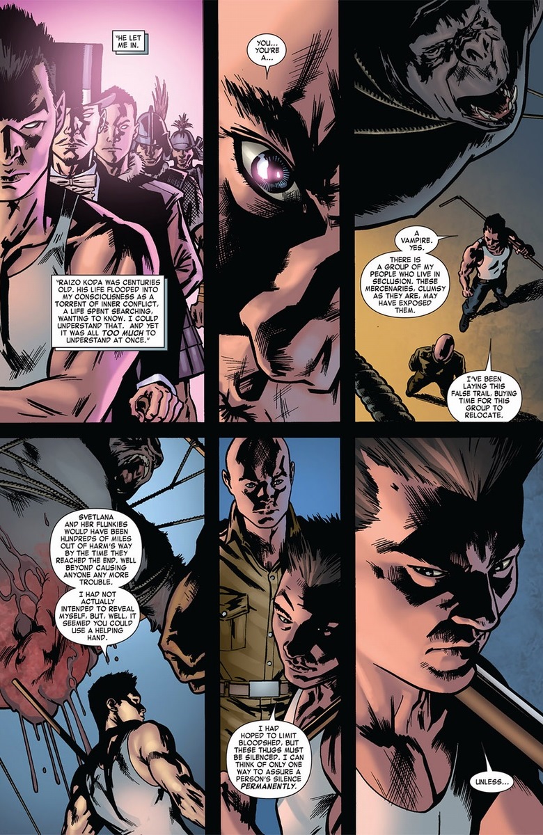 You can probably guess his secret. Hint: it starts with a “v” and ends in “–ampire.” Like all mythical monsters, you get the good and the bad populating a universe with billions of other fictional people. Take DC’s sword-wielding Frankenstein. DC’s ghost Deadman. Half of Blade. So when Professor X assures Jubilee that her actions from this point have no influence from the vampire baddies of the past, he has proof. That and the only vampire to ever wear a tank top.