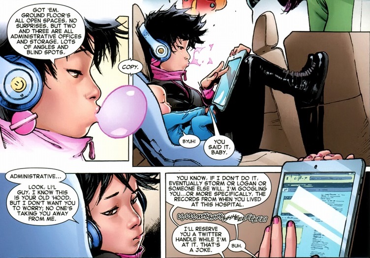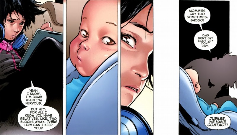 Posted: 07/18/2014 Filed under: Characters, Marvel Leave a commentAs we end our series where I update you on what Jubilee’s up to lately (finally you can sleep easy again), she’ll be embracing a role far more dangerous than bloodthirsty vampire: mother. While raising a child may be scary, raising a child in a world where dodging explosions is how most people get their daily cardio is downright terrifying. Today and Monday, we follow her arduous path in X-Men #1-6, volume four, written by Brian Wood and drawn by Olivier Coipel & David Lopez, to explain how her newest development came to be. Spoiler alert: it’s an “oops” baby, but not in that way, you pervert.