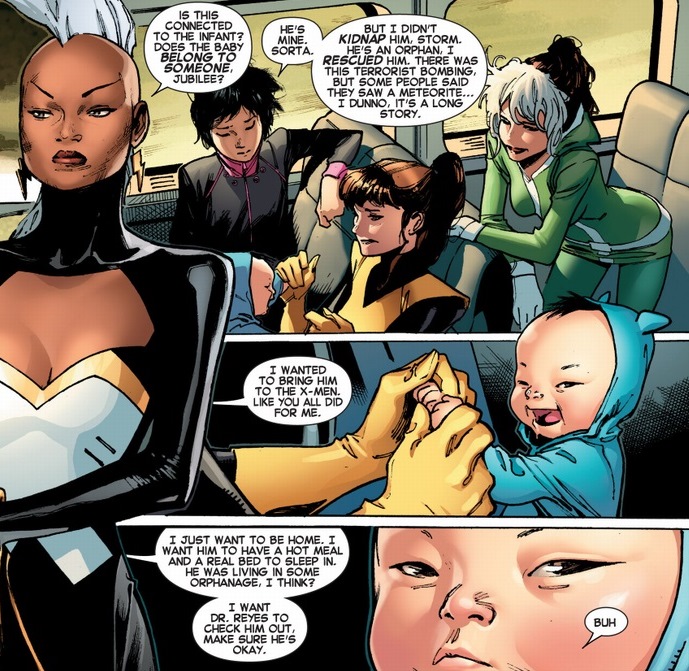I like to think Kitty Pryde said the words “oh my god” as opposed to only announcing the letters. That girl must be in her late teens by now, not halfway through middle school. Also, notice the accusations in Storm’s questions? She straight up thinks Jubilee swiped a baby from some random lady. But this child has no parents, so finders keepers, I guess. Welcome to the X-Men, baby.