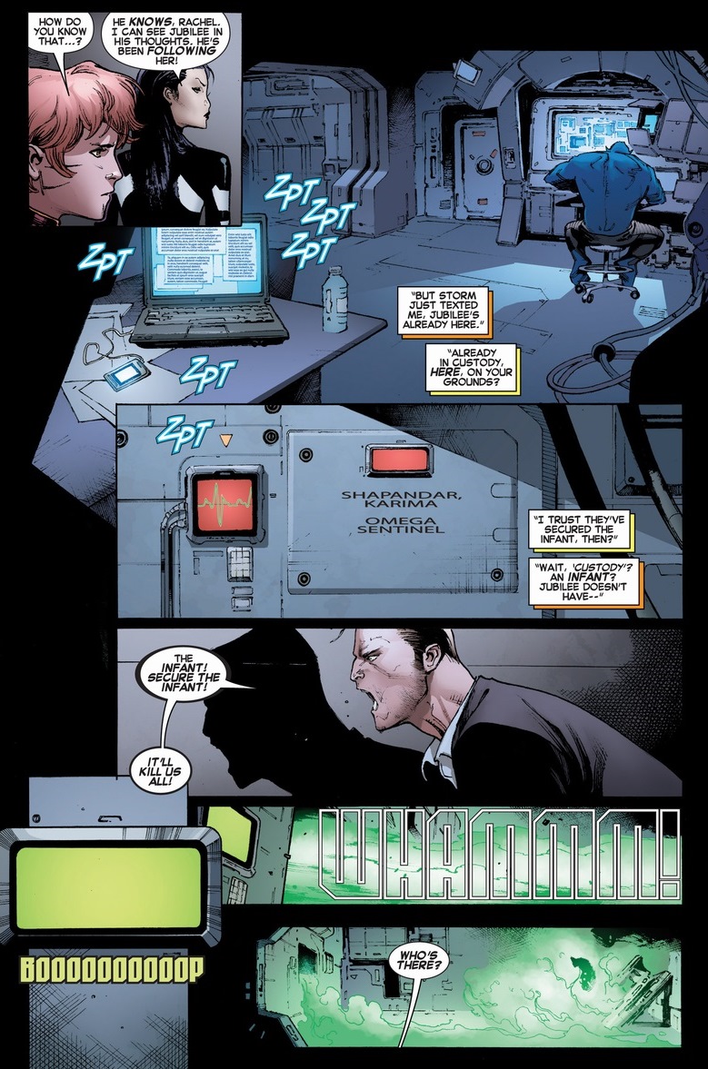 Arkea switches from the infant to cyborg superhero Karima Shapandar, the Omega Sentinel. You saw Days of Future Past, you know what those sentinels can do. I include the next page only so you can see the gorgeous picture of our vampire and her baby sleeping. Jubilee looks like a 1970s coke dealer. And her polka dot socks. I love it.