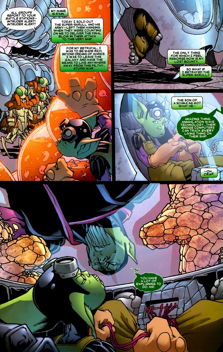 Y’see, poor R’kin hated the Super-Skrull so much (for surprisingly legitimate reasons) that he failed to actually listen to the Super-Skrull when the supervillain talked.  The whole plan to destroy this battleship came with two goals: to ensure his son’s legacy as the child of a hero and to die spectacularly in battle.  The Super-Skrull has been pretty open about the notion of him martyring himself.  We remember the heroes that died saving the Marvel universe far more fondly than those that continued to punch bank robbers well past their spotlight.  So yes, R’kin’s plan is a logical one, and yes, it does appeal to the Super-Skrull’s well-known moral ambiguity.  But y’know how this’ll work out.