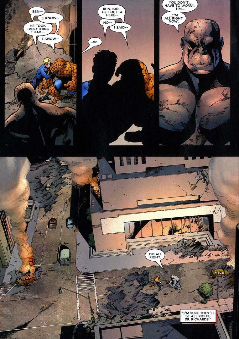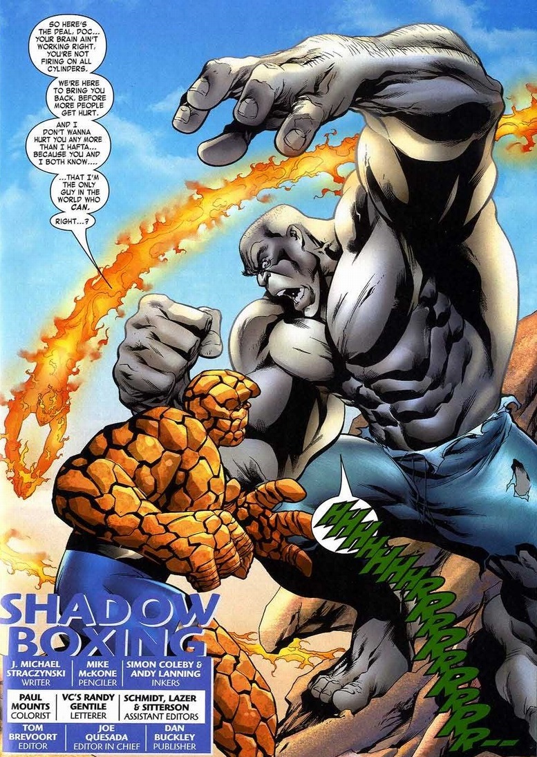 And a monster fight.  I wouldn’t post an article between these two behemoths without some punching involved.  Today, they get some extra therapy in a philosophical conversation between the only two people on Earth who understand what the other is going through.  Mainly being hideous monsters who just want do some good, be left in peace, and not let the self-loathing become overwhelming.  As happy as these two superheroes can eventually be, everything’s always covered in a thin layer of sadness over their unwanted transformation.  Sure, super strength’s nice, but being a Frankenstein-esque/rock creature isn’t.  In Fantastic Four #533-535, written by J. Michael Straczynski and drawn by Mike McKone, our two protagonists bond just a little bit more — in between the fistfight anyway.