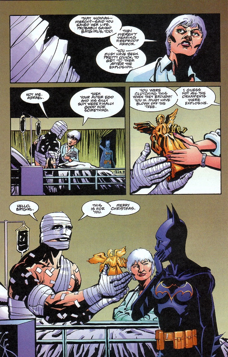 Moral of the story? Besides babies make terrible Christmas ornaments? It’s about the spirit of giving. Like giving yourself up as a flame shield to protect two ladies from a tree explosion. And the girl in the chauffeur outfit is Mercy Graces — Lex Luthor’s personal assistant/bodyguard. Azrael may have suffered injuries saving Batgirl and Mercy, but look, Luthor’s limo isn’t going to drive itself. Oh, and a delightfully happy ending: