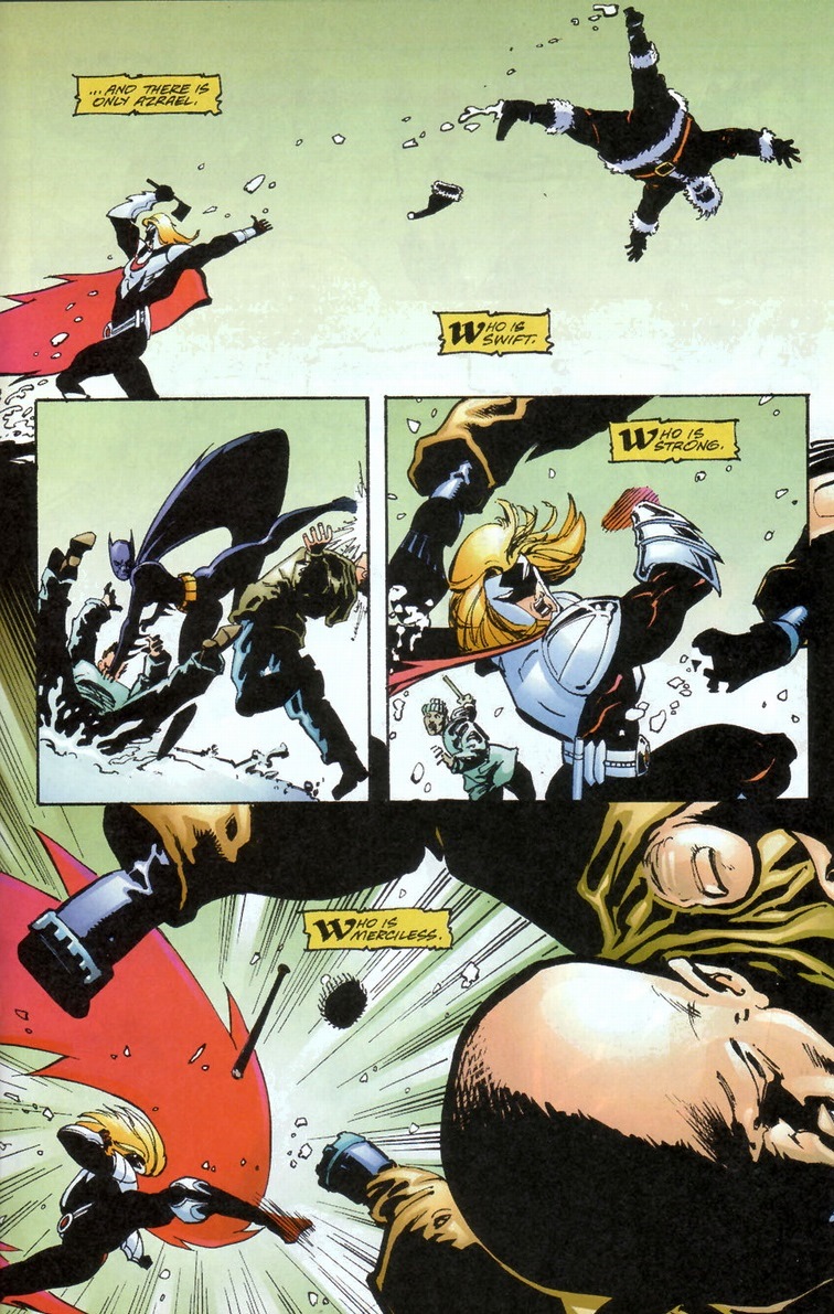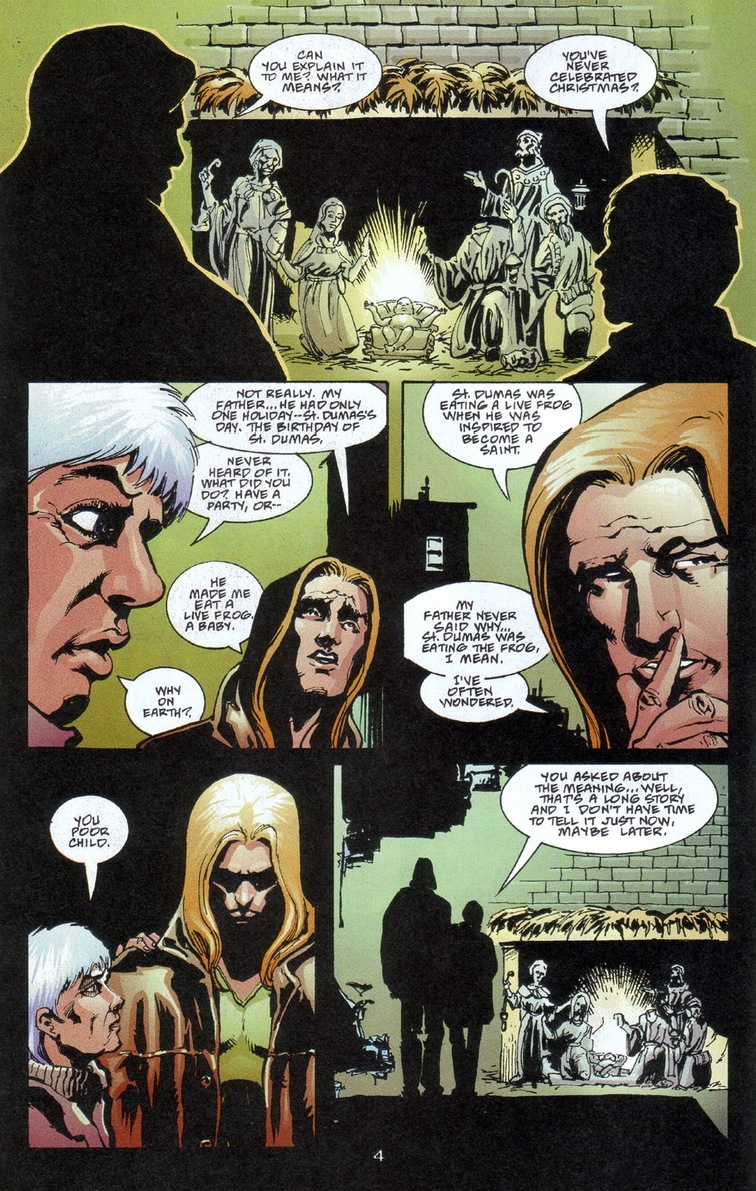 So No Man’s Land is over. Lex Luthor’s company stepped in to rebuild the city and the Gotham police force/Batman and friends have regained their hold over most of Gotham City. All that’s left is the Joker and his devious plot to kidnap dozens of babies. But that’s for later on. Azrael (real name Jean-Paul Valley) grew up religious, but more in a brainwashing cult than anything established like Christianity. Ever want to hear an old woman describe Christmas to a grown man who looks like Thor? Of course you do.