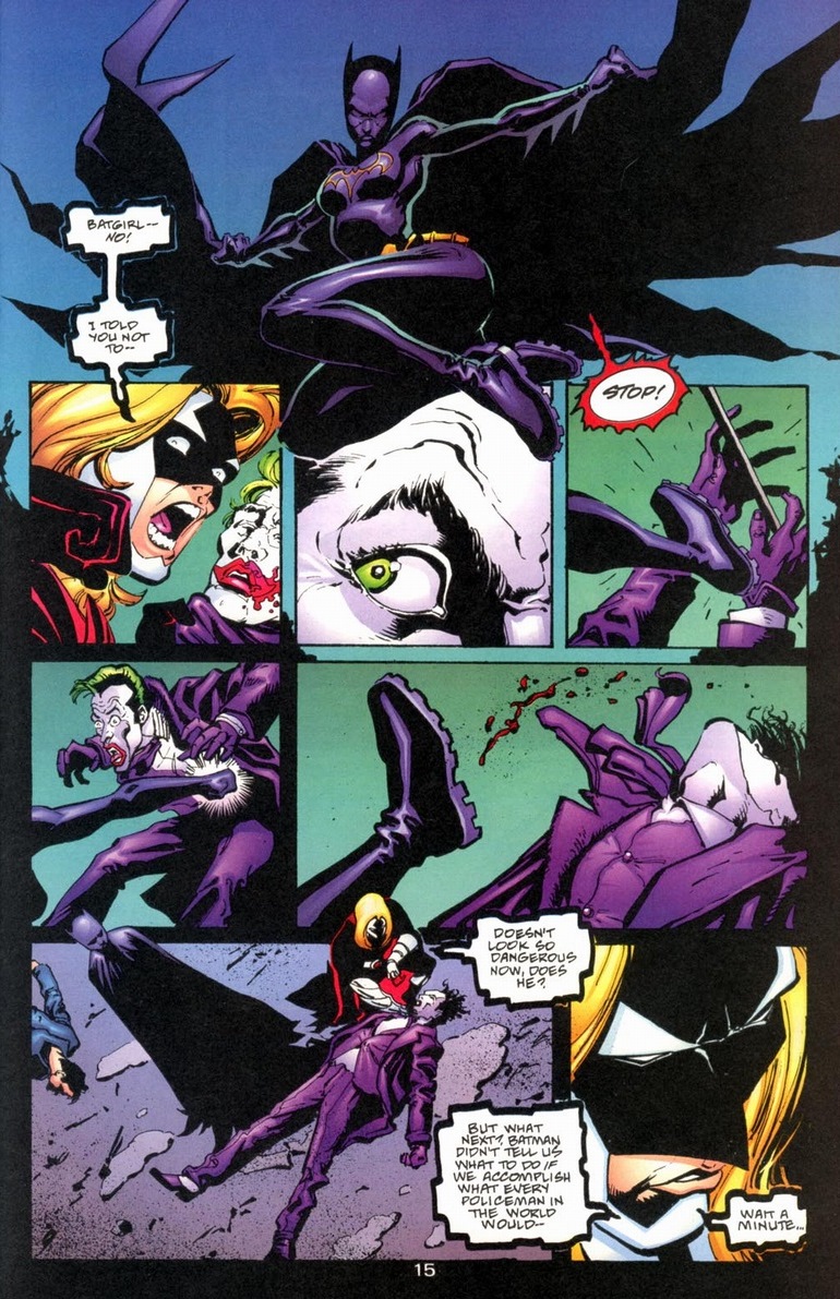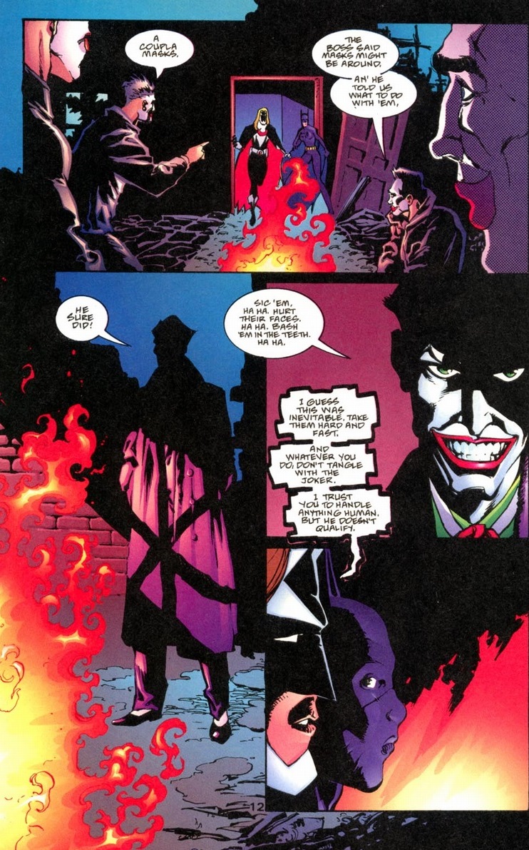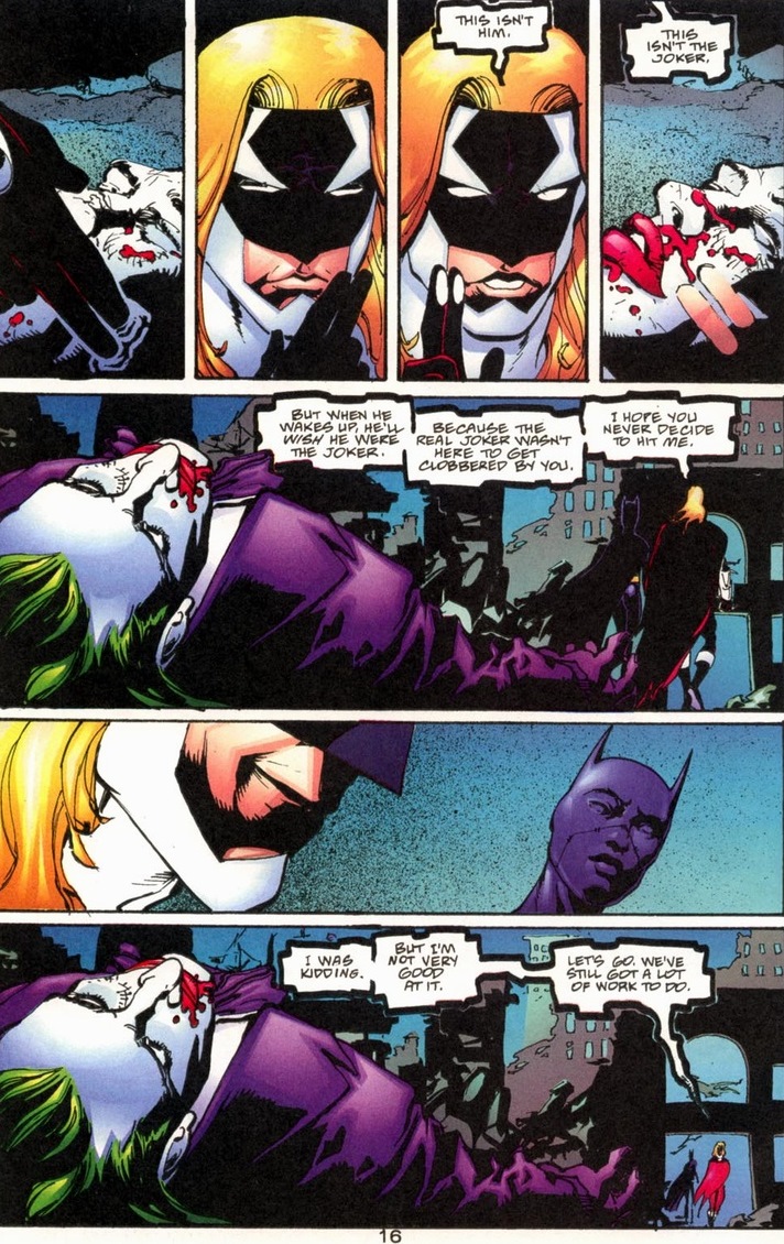 I know, I get it.  Azrael is the least funny person in the DC universe — don’t get upset, it’s part of his personality.  And it’s even worse when he makes a joke directed to the second least funny person in the DC universe.  But you saw that kid they all forgot about a few pages up — she gets rescued by the Joker.  And by rescued I mean almost certainly a forsaken causality in whatever drives Joker’s amusement at the moment.  You crave an exciting series of kicking and punching panels, but you don’t get it here.  First, Batman doesn’t want anyone but him hurting his one true love, but also, Azrael’s far too naive.  He’s not the detective that Batman or the Robins are.  He goes by instinct mainly, and his horribly wrong instinct saves the day.  Because y’know, despite being a psychopathic killer, the Joker still has feelings.