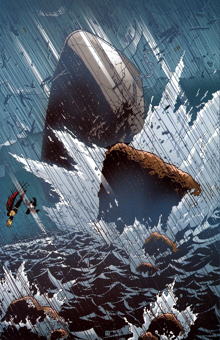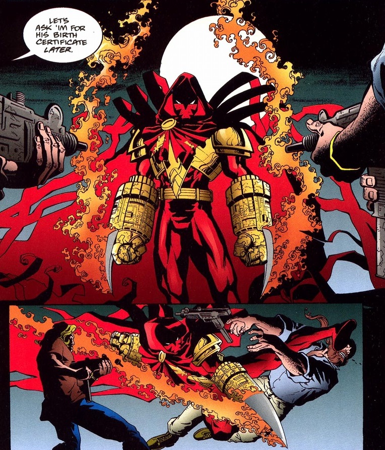 I’m no historian, but after the super gritty, dark, realistic comics of the late 1980s, the medium compensated with brighter, supernatural, “extreme” adventures.  The 2000s reacted to that by making comics dark again.  Nowadays, we’re in a resurgence of comics written with a lighter touch.  In five or six years, we’ll repeat the infinite cycle — after all, the 1980s came as a response to the trippy, magical LSD-fueled journeys of 1970s superheroes.  For reference, you’re currently watching Azrael kick henchmen butt in 1997.