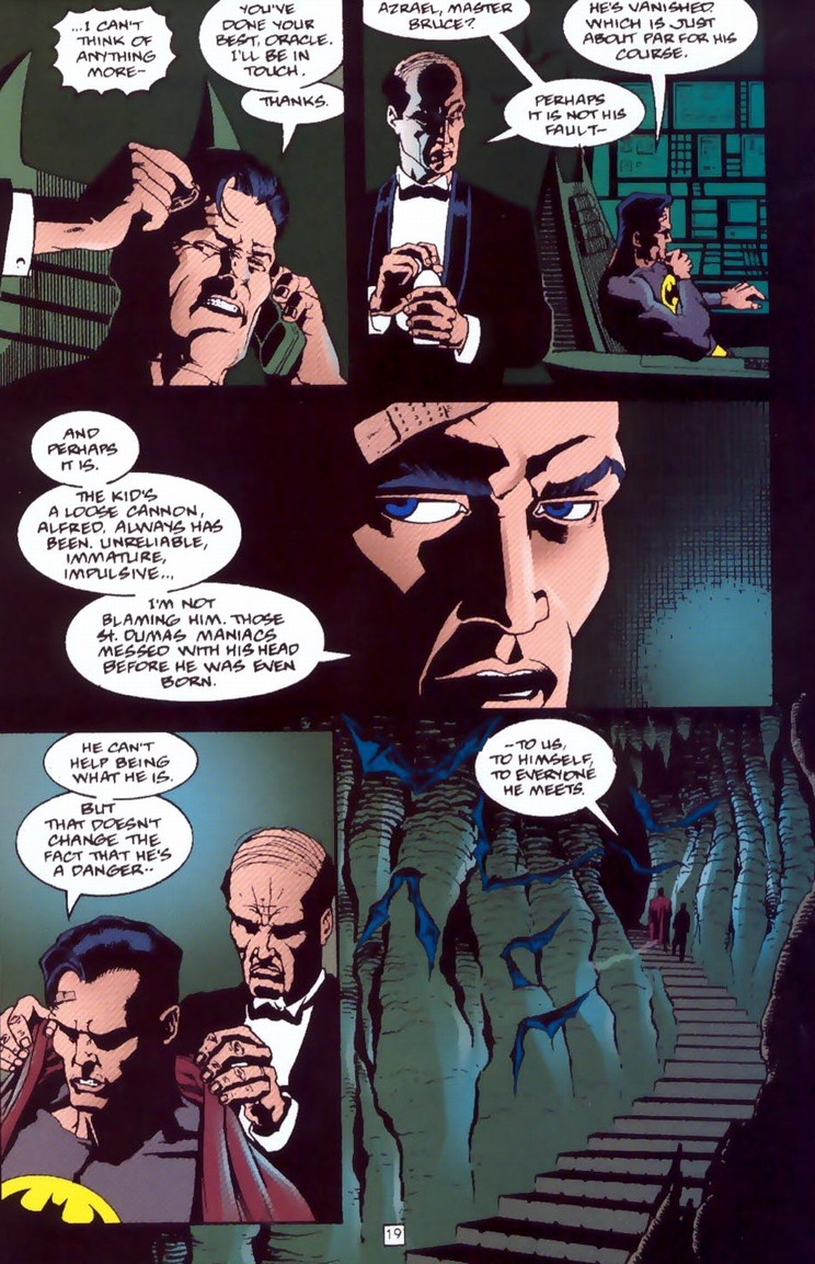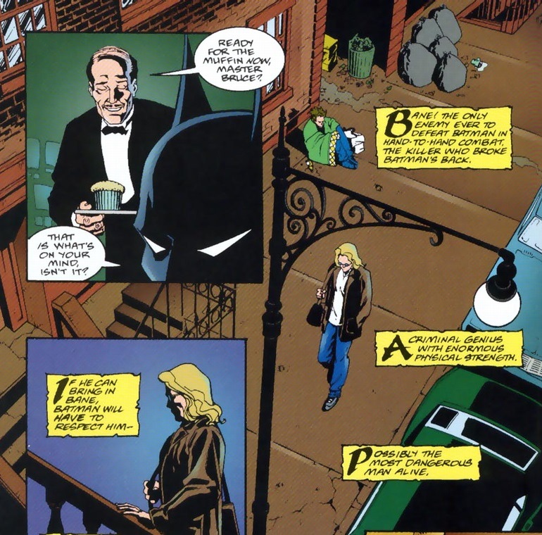 Seriously, conversing with Batman is like talking to your dad when he’s not angry, just disappointed. As usual in a crimefighter’s life, everything goes bonkers at once and Azrael misses his deadline. Also, love interests and stuff, but that’s off topic.  And let’s be fair to Azrael, he’s mentally ill trying desperately to impress another mentally ill man who may be legitimately impossible to impress. Batman can’t even meet his own standards — what chance does the Batfamily have?  But the stakes remain the same: Jean-Paul brings in Bane or Batman’ll punch Azrael out of crimefighting forever.