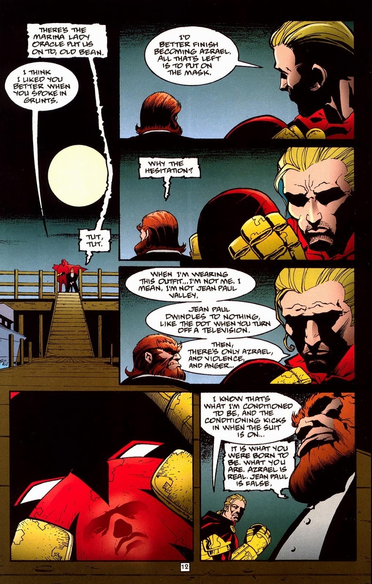 There is a greater theme here spread throughout the pages.  Jean-Paul’s constantly conflicted between his identity as Azrael and himself.  He can’t fight crime without becoming Azrael, but he hates Azrael’s cruelty and violence.  It’s a schizophrenia shaped by his dead father.  Oh, and check out that the dude’s back in his “default” costume.  Of the six Azrael articles I’ve done so far, he’s had three different outfits.
