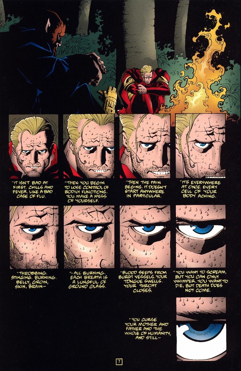 Posted: 09/19/2014 Filed under: Characters, DC 3 CommentsAs we left off last time, Bane filled up Azrael with a injection full of venom, the insanely addictive strength-increasing serum. And now Azrael has to go through some major withdrawal. Note: we ended on a ship crash, but I’m jumping ahead a good dozen pages. What you’ll miss: Azrael dramatically climbs a cliff wall, loses again to Bane and Bane’s soldiers, gets captured by Bane, becomes trapped in a cage, tricks Bane, and jumps over the cliff. It’s all exciting stuff you’re not going to see. Anyway, we pick up after that: